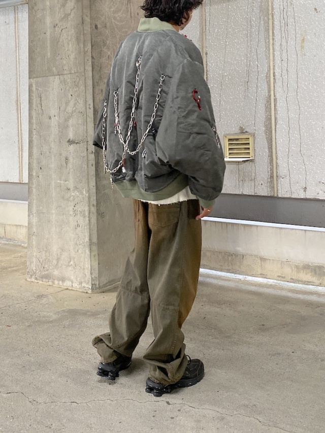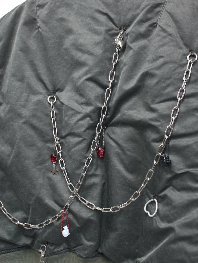 動くたびにチェーンが音を立て、ハートなどの可愛いチャームがきらりと光ります。背中や袖にも散りばめられたこれらの飾りは、遠くから見ると無骨な印象なのに、近づくほどに愛嬌を感じます。ぱっと見だけで判断するのではなく、目を凝らしてみてみることで気づくことがあるのかもしれません。このジャケットがそんな体験のきっかけとなったら嬉しいです。