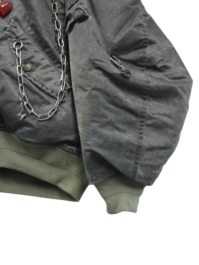 WITH EACH MOVEMENT, DELICATE CHAINS JINGLE, AND PLAYFUL CHARMS LIKE HEARTS GLISTEN IN THE LIGHT. FROM AFAR, IT MAY APPEAR RUGGED, BUT UP CLOSE, IT REVEALS A WHIMSICAL CHARM. RATHER THAN JUDGING AT A GLANCE, TAKE A CLOSER LOOK--YOU MIGHT NOTICE A DIFFERENT SIDE. WE HOPE THIS JACKET SPARKS THAT EXPERIENCE FOR YOU.