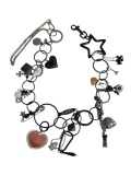 無数のアクセサリーがじゃらじゃらと連なる、存在感たっぷりのキーチェーン。一見無秩序に見えるモチーフの数々ですが、ハート、南京錠、動物など、さまざまな意味や物語を感じさせるチャームが散りばめられています。