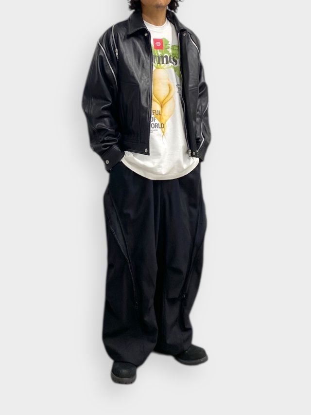 Constructed from multiple leather parts patterned with infinite efficiency from a single hide, derived using Synflux's 3D design technology. When the zipper is closed, it forms a three-dimensional shape: partially opening it allows airflow or the arms to be exposed, enabling the wearer to change how it's worn according to movement. The washed cowhide develops character the more it's worn. When Synflux's cutting-edge algorithms minimize fabric waste, traditional craftsmanship is passed down, and forward-thinking technology converges that's when true gratitude for the materials, embodied in the Japanese phrase “itadakimasu,” truly emerges.