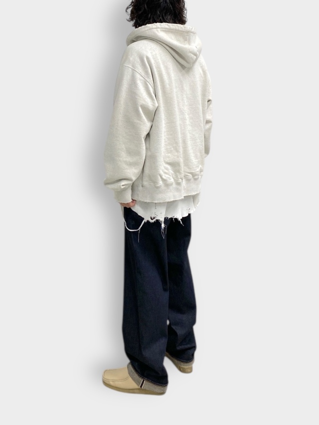 一般的なワンウォッシュのデニムでは満足できず、履き始めからムードのある深いインディゴを目指し、オリジナルのセルビッジデニムの製織から着手。洗いにかけるだけではなく、深いインディゴに茶系の染料を重ね、その上からもう一色をレイヤーで重ねています。ワンウォッシュにも手間を惜しまぬことで、黒々とした深みと表情を作り込みました。シルエットは程よい太さのストレート。腰回りにゆとりを持たせながら裾まで落とすことで、誰にでも、何にでも合わせられるバランスを目指した#03。長年で培ってきたデニムのレシピを見つめ直しながら、コレクションに合わせて各寸法をミリ単位で調整しています。立ち姿が非常に美しく映り、全身を持ち上げてくれる一本。より多くの方にご着用頂きたいと思っています。先行リリースされたSELVEDGE DENIM JACKET TYPE-01 INDIGOとのセットアップが可能です。日本製。