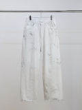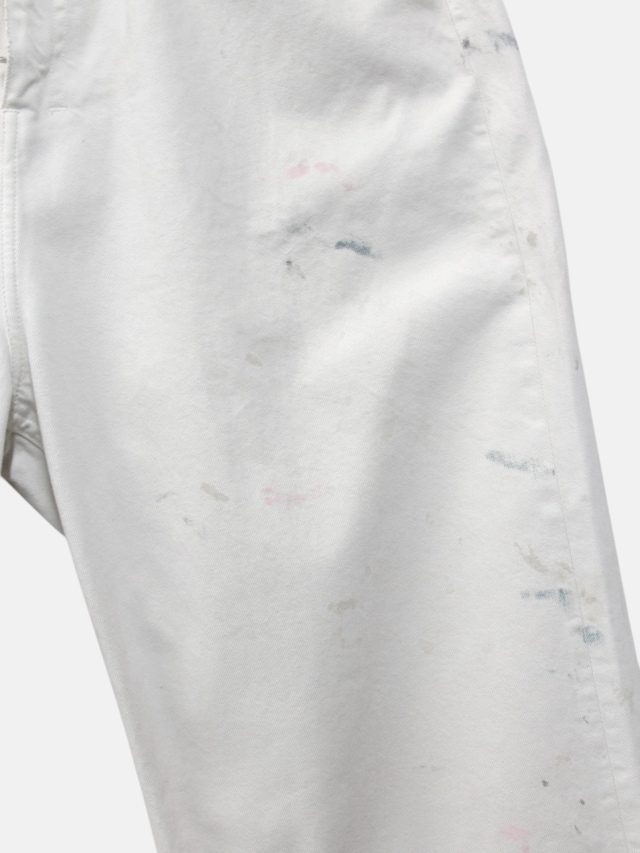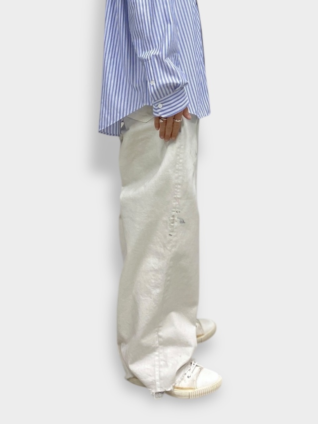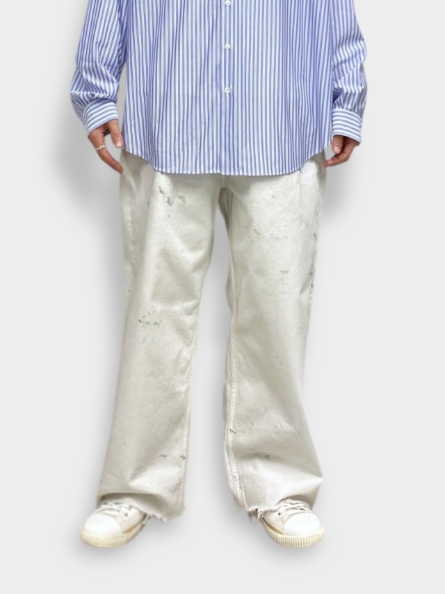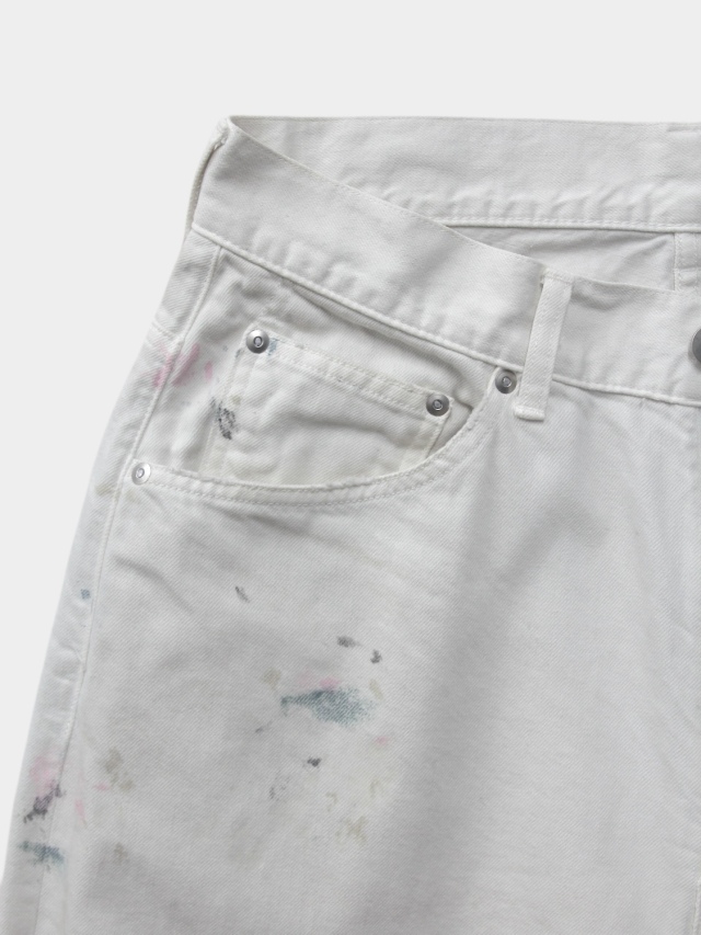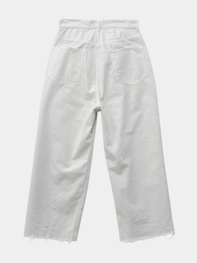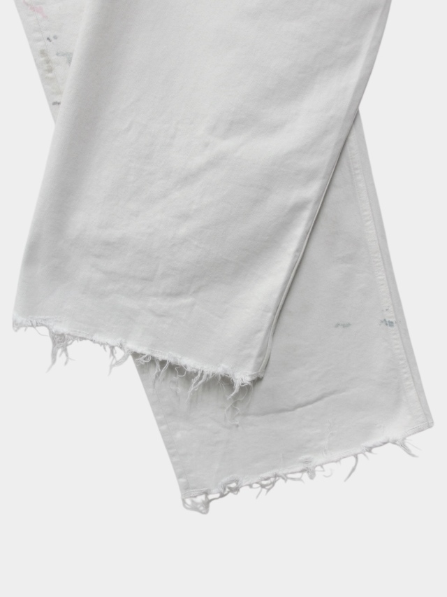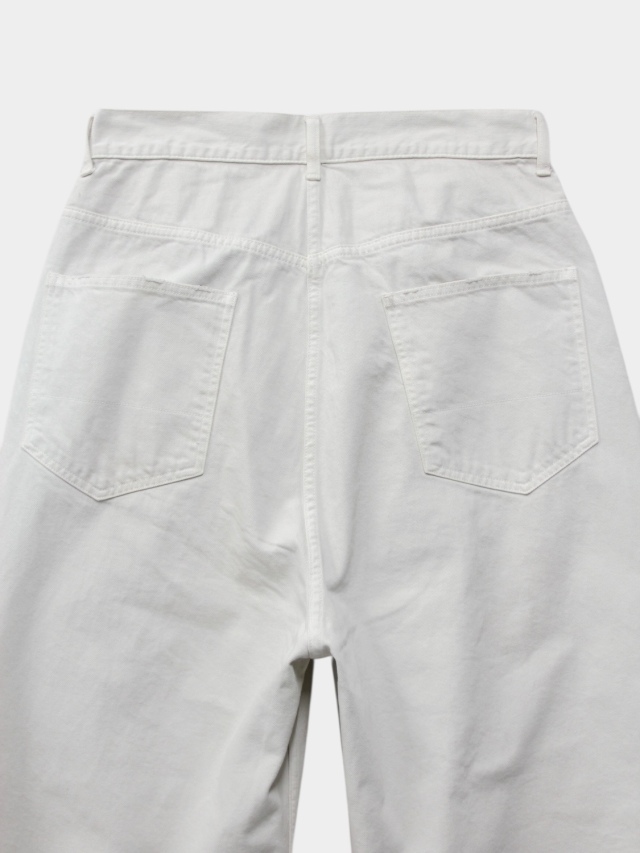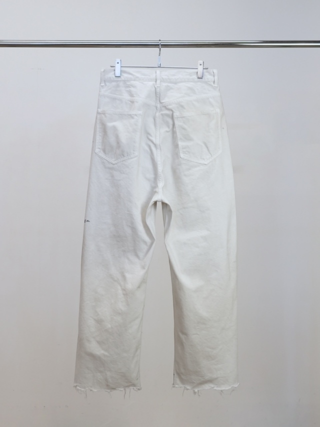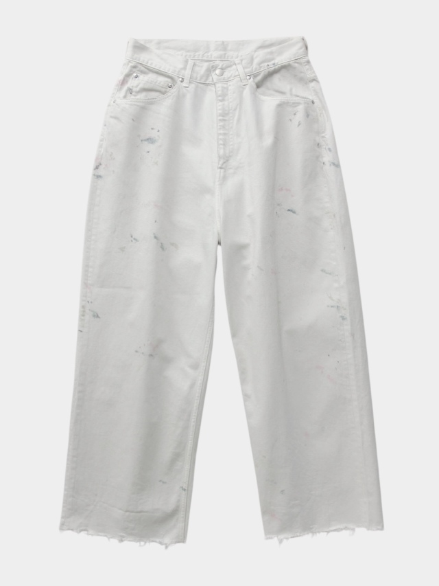 #05 features a generous fabric allowance for a wide silhouette that falls beautifully toward the hem. Its bold, substantial width makes a statement while creating a stunningly clean fit and a beautifully three-dimensional silhouette when worn. Skilled artisans meticulously hand-process each pair, carefully balancing every small imperfection. For WHITE, layering white upon white creates a deep, dimensional expression. For INDIGO and BLACK, a base color is first faded, then uniquely blended shades are applied in layers light, medium, and dark to refine the allure and establish the brand's signature mood. Furthermore, this type-C focuses on the color balance of the distressing, emphasizing each hue's individuality through multiple layers of color. Observe the dramatically different expressions each color yields. We believe we've achieved an iconic, powerful look and a rugged yet refined beauty. This denim demands immense effort and time, requiring countless processes and adjustments, often necessitating late-night visits to the workshop. We invite you to experience it. Made in Japan.