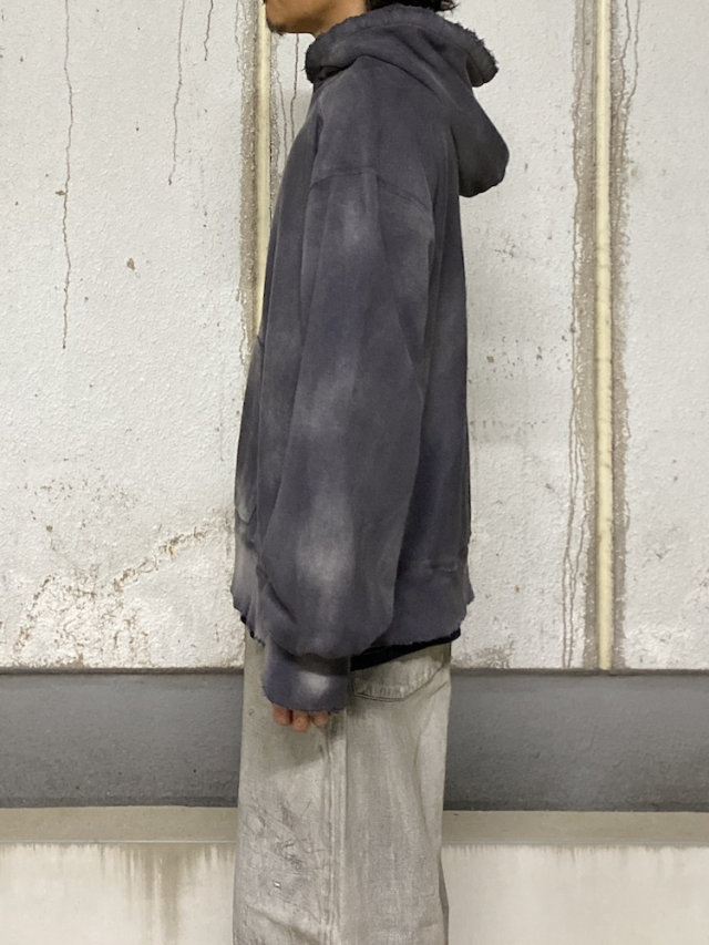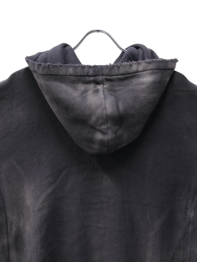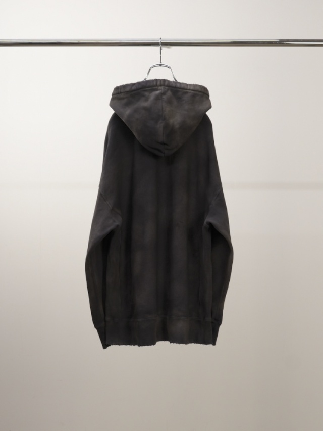 独自の染色技法と加工から生み出したグラデーションの美しいスウェットフーディ。一着たりとも同じものは作れないランダムに現れる色彩の個性。水に広がるようなグラデーション。美しさと迫力を兼ねた力作です。1950-1960年代のヴィンテージから研究し弾力と肌当たりが良い生地を使用。使い込むことで育っていく楽しみがあります。定番で作り続けているフーディですが、時代に合わせて細かく寸法を調整しながらアップデートを重ねております。深いムードとシルエットの美しさ楽しみながらより深く育てていただけると嬉しいです。日本製。