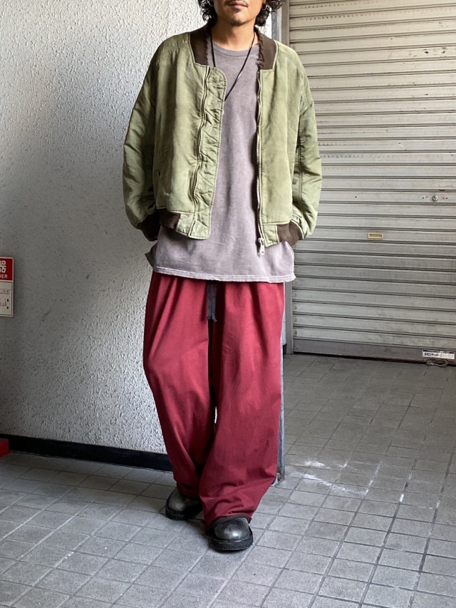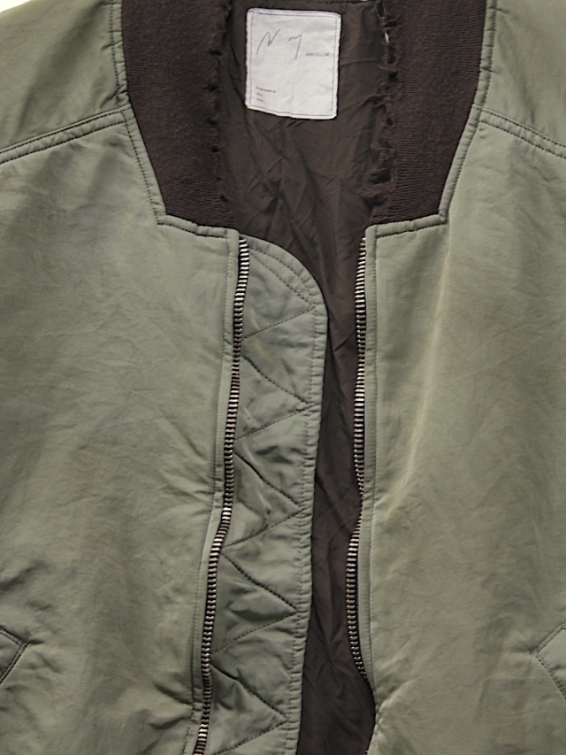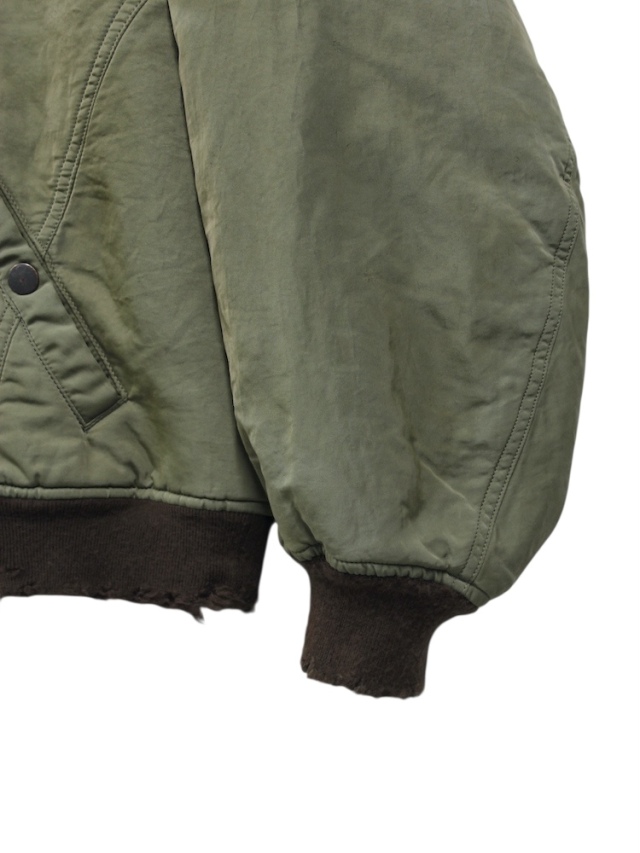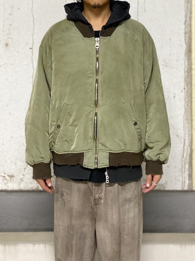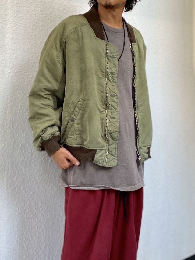 This bomber jacket draws inspiration from vintage flight jackets across various countries, modified for modern wear. The collar opening is slightly reworked into a shape reminiscent of traditional Japanese attire, creating space around the neck for layering with turtlenecks or hoodies. Set to a single length that's easy to wear without being too short, pattern techniques emphasize drape and fit. Processing involves applying a strong fade to the nylon, creating a deep, smoked appearance uncommon for synthetic fabrics, adding character through distressing. Achieving the right fade on synthetic materials is challenging; we explored the limits of the fabric and processing through trial and error. The zipper features a vintage design from Waldes, a company active in America long ago. We pursued an aged mood, achieved through the uneven shrinkage created by the garment wash. It's a confident piece that combines warmth and functionality with a moody vibe, despite being relatively lightweight. We encourage you to try it. Made in Japan.