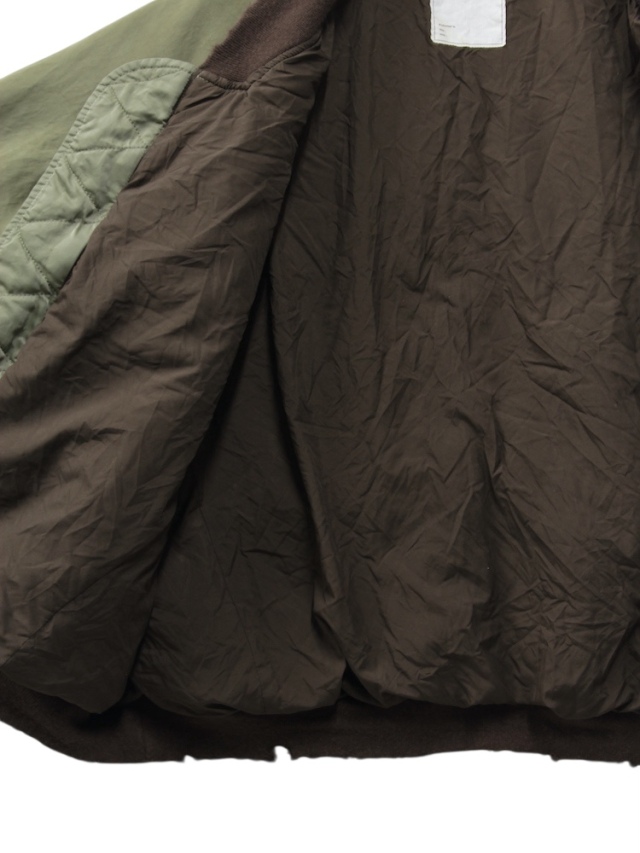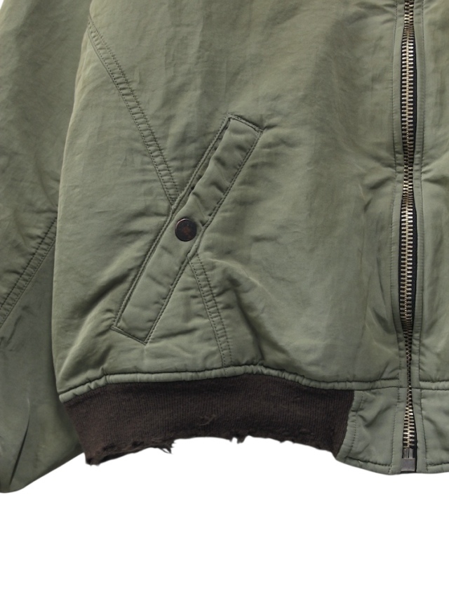 様々な国の古いフライトジャケットを参考に今の時代へモディファイさせたボンバージャケット。タートルネックやフーディなどを重ねられるよう衿の開きを少し和装のような形に置き換えることで首周りにレイヤードの余白を設けております。単丈ながらも短すぎない着やすさで設定しパターンのテクニックで落ち感と収まりを強調。加工面ではナイロンに強いフェードをかけ化繊には珍しい奥深く燻んだ表情を作りダメージでキャラクターを追加しております。化繊に対するフェードは塩梅が難しく素材と加工の限界点を探りながら試行錯誤しました。ZIPには古くのアメリカで使用されていたWALDES社のデザインのものを使用。製品洗いによる縮率差によって蛇行が生まれた古めかしいムードを追い求めております。比較的軽量でありながらも暖かく機能と使い勝手にムードを併せ持たせた自信作です。是非、お試しください。日本製。