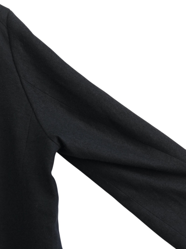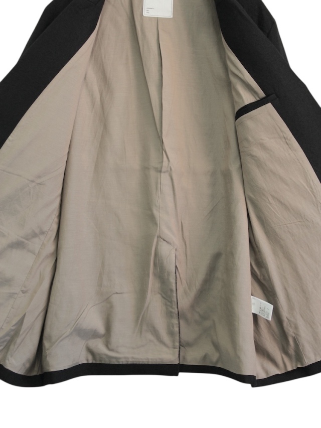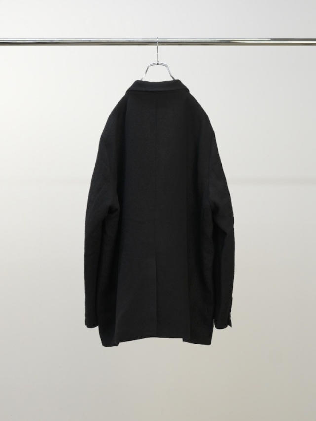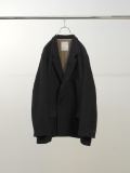 This semi-double tailored jacket was designed as a light and casual outer garment. The double-breasted front is designed to be worn open, maintaining a well-structured silhouette. By lowering the gorge line and dropping the shoulders, the jacket retains the refined mood of a tailored garment while creating a relaxed, soft silhouette. Additionally, by standing up the lapels and opening the front, the jacket can be worn as a stand-up collar jacket, offering a different style option. The fabric combines wool and linen in a soft weave to add texture. By shrinking the fabric and enhancing the heathered effect and fluffiness, it achieves a substantial lightness while maintaining a heavy mood. It offers effortless ease of wear and a relaxed heaviness. This jacket balances mood and functionality. Please try it out. Made in Japan.