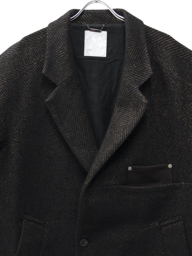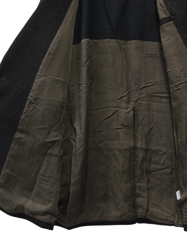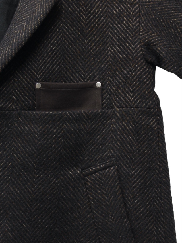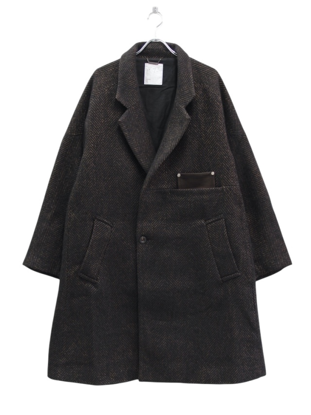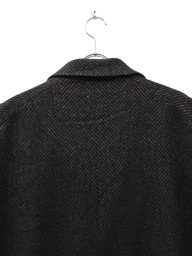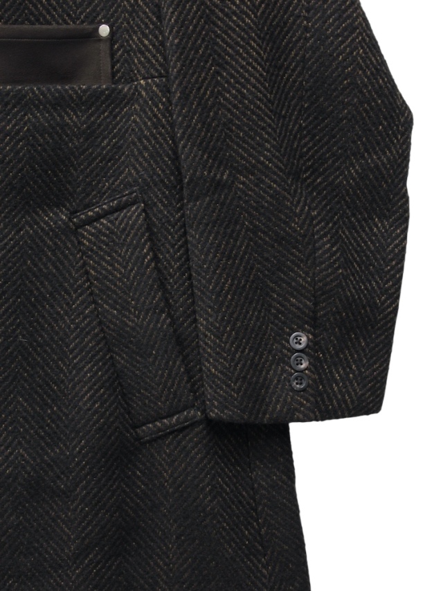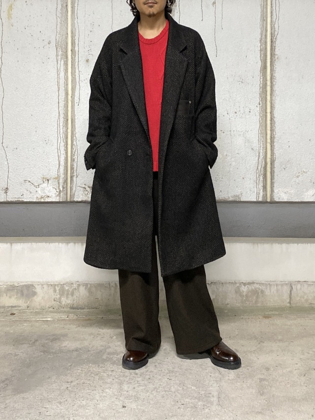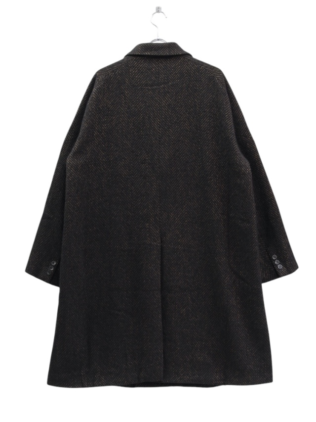 A long coat tailored in an original herringbone fabric, featuring a relaxed fit with a swaying hem. The double-breasted front is designed with a shallow overlap and a low gorge line, creating a dropped shoulder that lends a classic mood while achieving a modern, effortlessly soft silhouette. The fabric is an original textile made from a wool-based, loosely woven base that holds texture. Shrinking the fabric enhances the mottled effect and raises the pile richly, expressing a melancholic texture perfect for autumn and winter. As an overcoat, the lining is meticulously chosen for smooth sleeve movement and excellent warmth retention. Contrasting materials are used as accents on the collar lining and pockets. To enhance the three-dimensional look when worn, the pattern underwent numerous detailed adjustments to achieve a beautiful A-line silhouette. Despite its substantial appearance, the coat is relatively lightweight, making it easy to wear without feeling weighed down. We invite you to try it. Made in Japan.