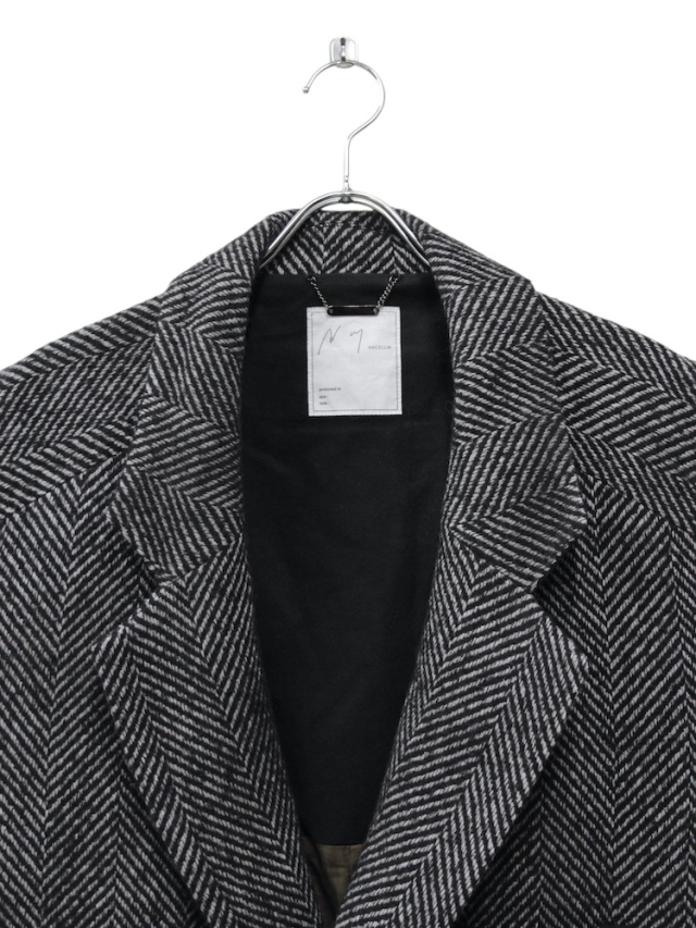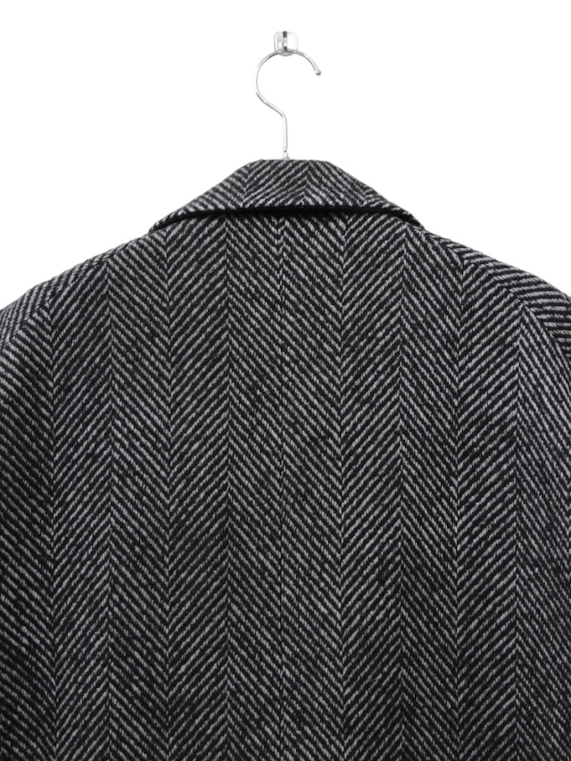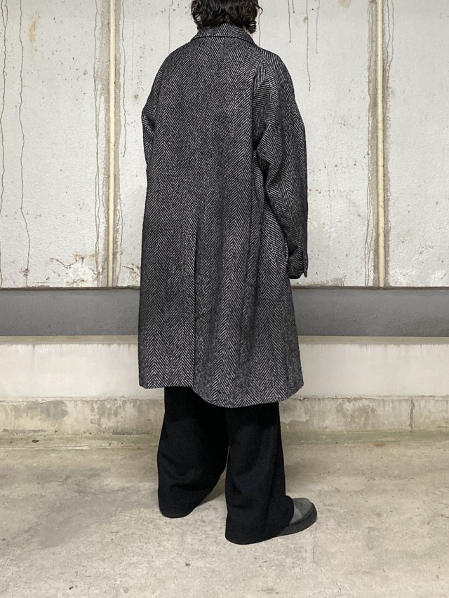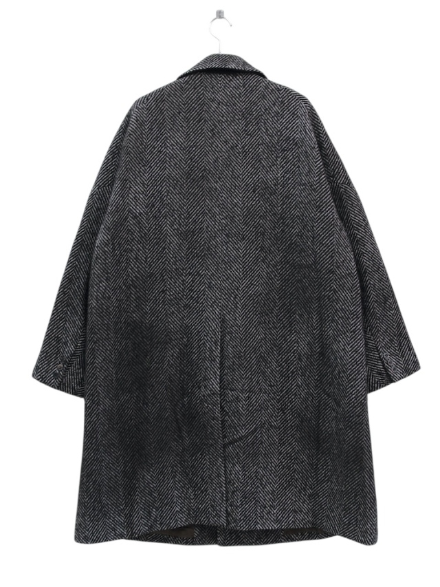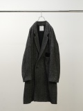 A long coat tailored in an original herringbone fabric, featuring a relaxed fit with a swaying hem. The double-breasted front is designed with a shallow overlap and a low gorge line, creating a dropped shoulder that lends a classic mood while achieving a modern, effortlessly soft silhouette. The fabric is an original textile made from a wool-based, loosely woven base that holds texture. Shrinking the fabric enhances the mottled effect and raises the pile richly, expressing a melancholic texture perfect for autumn and winter. As an overcoat, the lining is meticulously chosen for smooth sleeve movement and excellent warmth retention. Contrasting materials are used as accents on the collar lining and pockets. To enhance the three-dimensional look when worn, the pattern underwent numerous detailed adjustments to achieve a beautiful A-line silhouette. Despite its substantial appearance, the coat is relatively lightweight, making it easy to wear without feeling weighed down. We invite you to try it. Made in Japan.