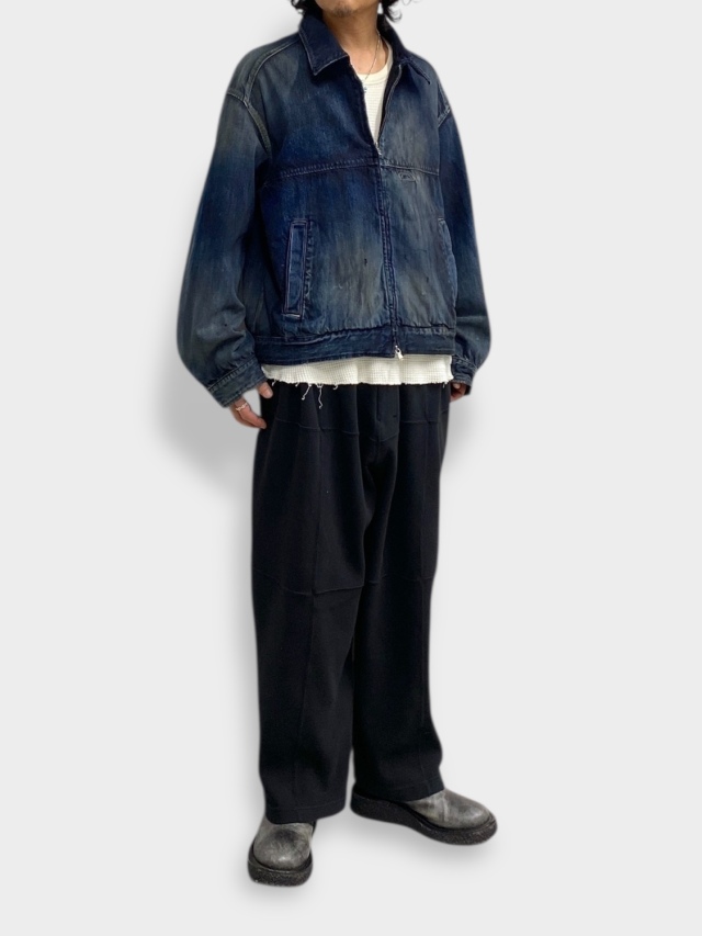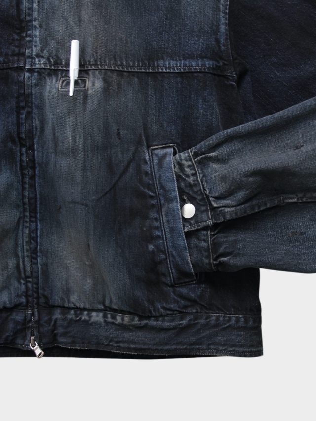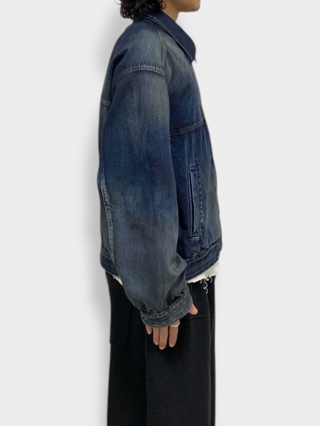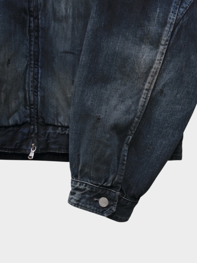 新型として製作したフルジップのデニムジャケット。ANCELLMで得意としているデニムの技術を駆使し、手擦りでのフェード、色の重ねなど多くの工程を経て、美しいグラデーションとコントラストを描きました。2カラーでの展開ですが、両色共に同じデニムから着手し、色作りで表現を変えております。INDIGOは素材の色を尊重し階調の美しさを重視。BLACKでは黒を載せてからフェードさせることで、素地の色が顔を覗かせます。ワークウェア由来の小さなポケットをアクセントに置くのみで、デニムの持つ強い表情を曇らせないよう出来るだけシンプルに構築し、パターンで立体感を持ち上げています。ダブルジップで上下の開きを調整し、シルエットを変えながらお楽しみください。日本製。