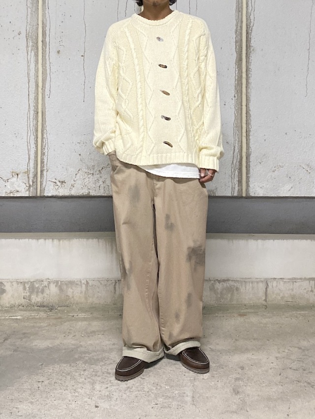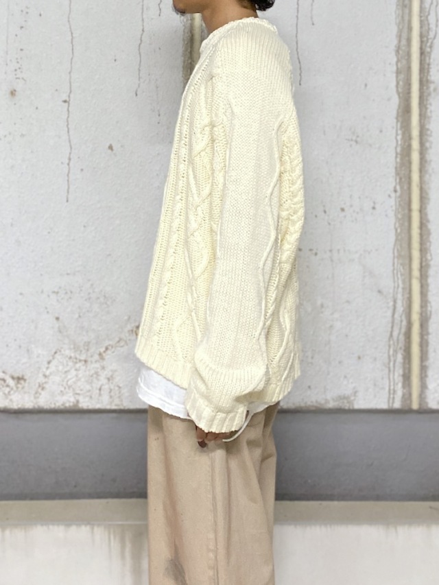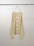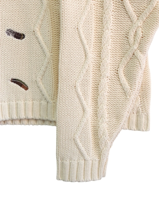 This cable knit sweater is knitted with thick cotton yarn. Inspired by the fact that patterns vary from family to family, we designed the cable pattern as ANCELLM. As this is an authentic item, we have carefully researched the length, width, shoulder fit, and sleeve fit to give it a modern silhouette. The knit pattern draws inspiration from various fisherman sweaters, seeking a balance that pairs well with fashion. Considering durability and the length of the wearing season, we opted for cotton instead of wool, hoping you will enjoy the natural aging that comes with long-term use. Seeking to create something uncommon even in its long history, we referenced handmade vintage garments from the past and applied feather-inspired embroidery in an analog style. This ambitious piece was challenging to create, as combining the delicate knit fabric with high-density embroidery proved difficult. Let the embroidery peek through as an accent from beneath the garment. Please give it a try. Made in Japan.