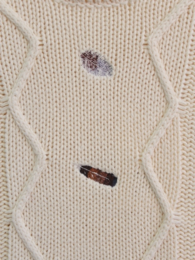 太番手のコットンで編み上げたケーブルニット。家庭によって紋様が異なるという文脈からANCELLMとしてのケーブルをデザインしました。オーセンティックなアイテムだからこそシルエットを現代的に置き換えるため、着丈や身幅に肩の落ち方や袖の溜まり方まで綿密に研究を重ねております。編み柄には様々なフィッシャーマンセーターを参考にファッションとして合わせやすいバランスを探りました。長年の愛用から経年変化も楽しんで頂きたく丈夫さと着用シーズンの長さを考えた結果、素材にはウールではなくコットンを使用しております。長い歴史の中でもあまり見かけないものを製作したく昔着ていたハンドメイドの古着を参考にアナログなムードで羽飾りの刺繍を叩きました。甘い編地に高密度な刺繍を叩くのが困難でなかなかに苦労してしまった意欲作です。羽織物の中からアクセントに覗かせてください。是非、お試しください。日本製。