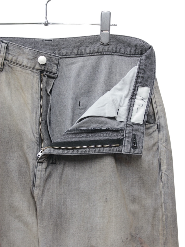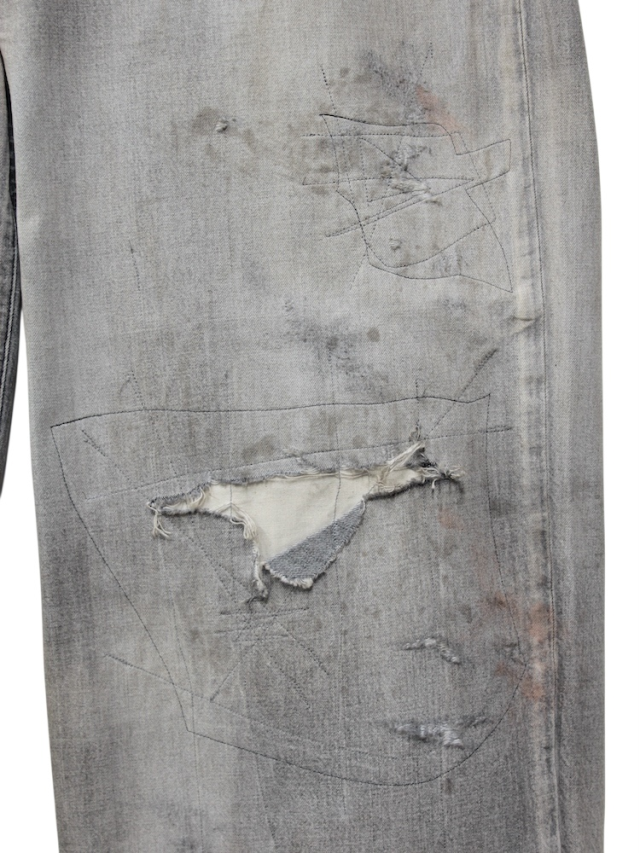 ANCELLM's core denim pants have been updated across the entire collection starting with this release. #04 features a bold, wide straight silhouette that falls beautifully to the hem. We meticulously refined the pattern down to the millimeter, carefully balancing the fit with the upper body, how it sits on shoes, and the overall look. While the measurements appear large, the pants settle beautifully when worn, creating a stunning three dimensional silhouette when standing. For AGING 01's color development, we create the brand's signature mood by applying uniquely blended shades over a base color set to a faded tone. These layers light, medium, and dark refine the color's allure. For the repair process, skilled artisans meticulously hand-apply patches to each pair, stitching them in place with a sewing machine. To make the repaired sections appear artistic when cut open, we deviated from conventional methods. Stitching is applied freely in all directions, scattering the distressing to add mood and impact. This masterpiece is the result of extensive trial and error, ensuring the refined gradient and rugged processing coexist in beautiful imbalance. The journey from concept to production was truly arduous. We invite you to experience it. Made in Japan.