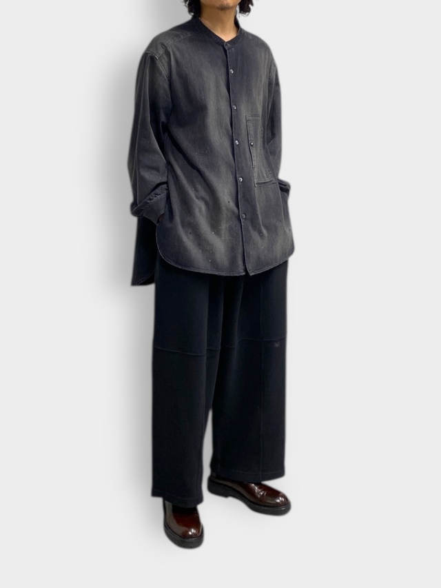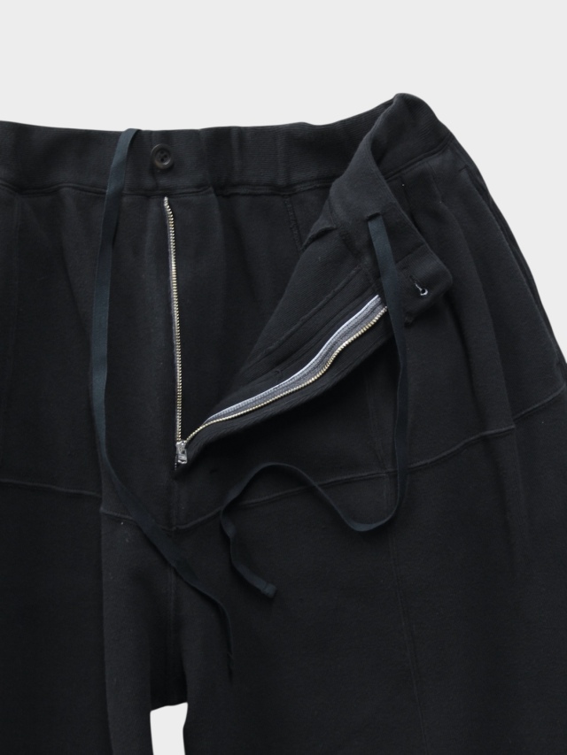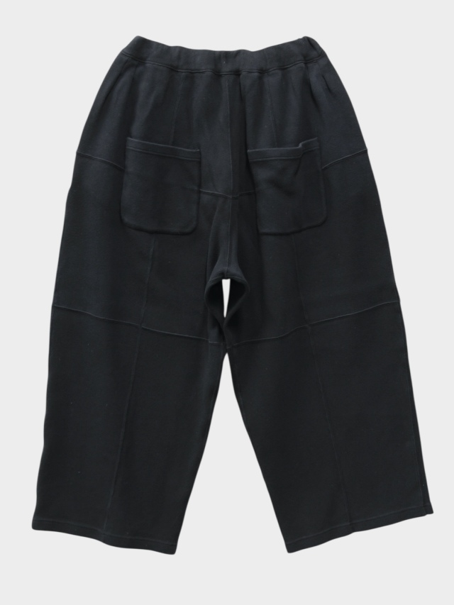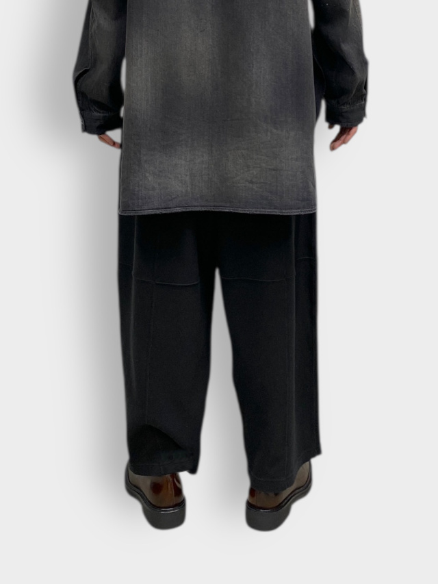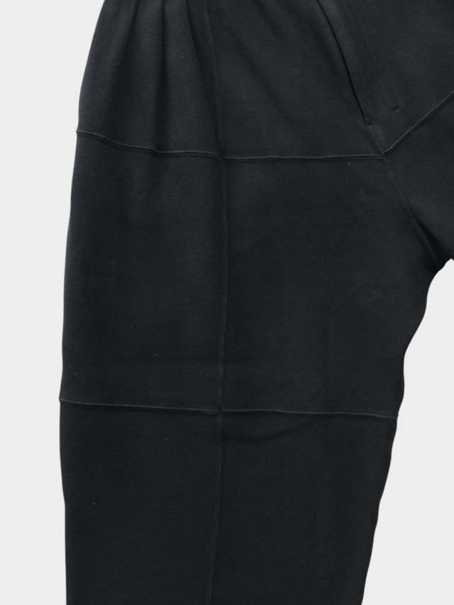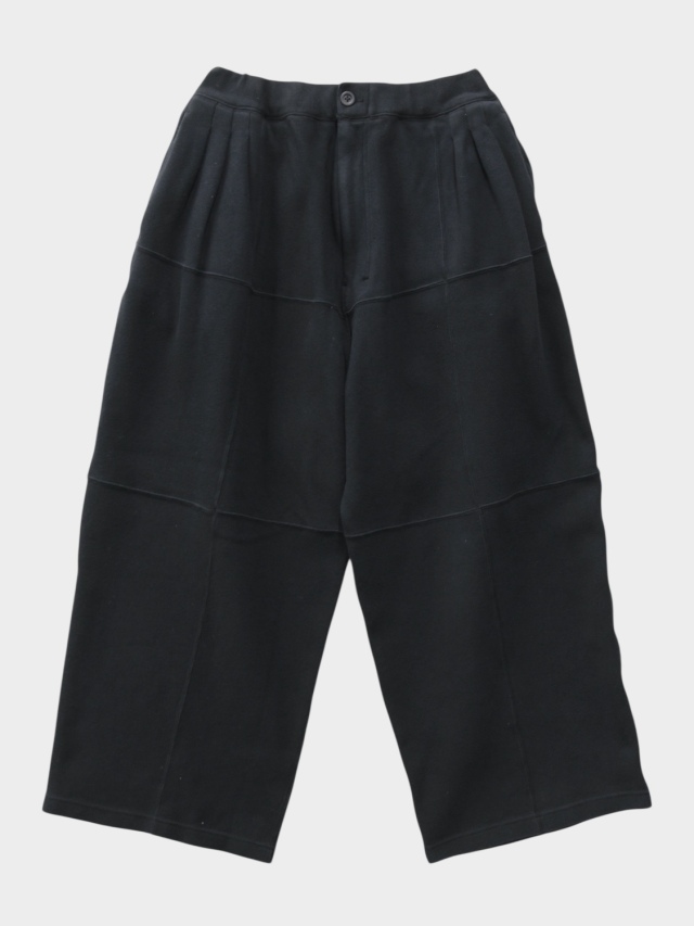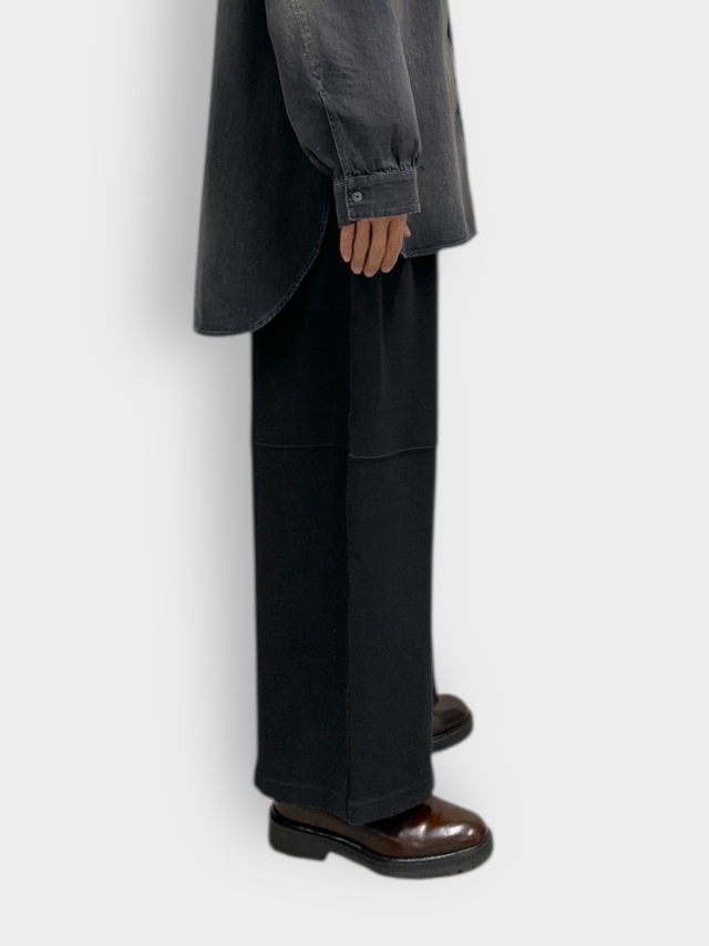These smooth knit pants utilize panel switching to create a three-dimensional look. We improved the soft smooth knit typically used for undergarments by developing it with thicker yarn, adding a sweatshirt-like texture and comfortable elasticity. This original textile features a base color created through dyeing, with additional layers of color applied to give depth to the appearance. Despite the generous actual measurements, the pattern creates a relaxed, expansive silhouette with three-dimensional volume. Combined with the fabric's drape, this results in a dynamic look when worn. It sits cleanly like slacks, offering a light feel from comfort to appearance. Designed to bring joy with every step. Made in Japan.