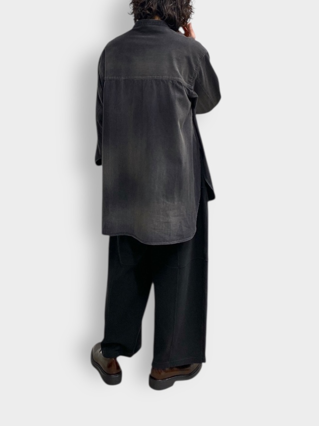 パネルでの切り替えを駆使し、立体的な表情を作ったスムースニットのパンツ。本来は肌着などに使われる肌当たりの良いスムースニットを改良し、太番手の糸を採用して開発することでスウェットに似た表情と心地良い弾力を加えております。染色でベースカラーを作り、さらに色を重ねることで表情に奥行きを持たせたオリジナルのテキスタイルです。実寸値の大きなシルエットですが、ゆったりと広がり立体的な膨らみを見せるパターンと生地の落ち感が合わさり、着用時には大きな動きが現れます。スラックスのように綺麗な収まりを見せ、履き心地から映り方まで軽快で、一歩踏み出す度に楽しさを感じて頂ける設計です。日本製。