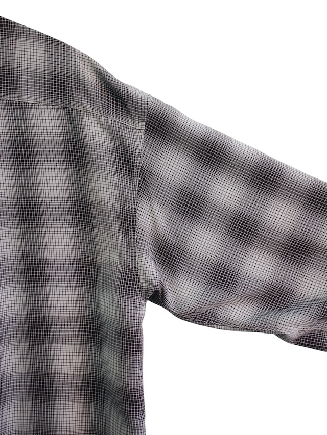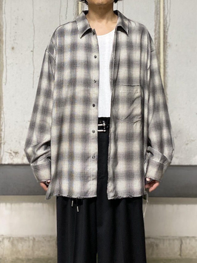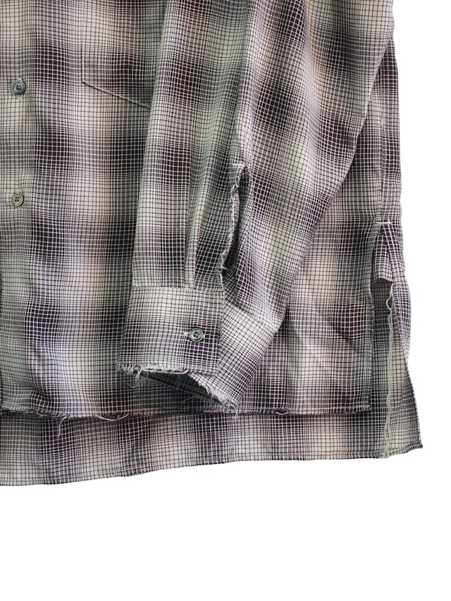 春夏シーズンで作り続けているRAYON100%のチェックシャツです。様々な年代からVINTAGEのレーヨンシャツを集め肌当たりも肌馴染みも良く着ていて一番気持ち良い素材を厳選。ミリ単位でチェックのサイズバランスを探り、現代の技術によりオリジナルで生地を織り上げました。PINKでは桜のように儚げな淡さを表現し、BROWNでは奥行きとムードを強調。ありそうでなかったカラーなのですが色の合わせやすさを意識して落ち着いたコントラストで仕上げております。着やすく身近なシャツを目指してゆったりと寸法を取ったパターンながらもレーヨンのとろみが効いて落ち感が良く肩も身頃も綺麗に収まるよう設計。衿元はトップボタンの開け閉めでオープンにもレギュラーにも変わるフレキシブルな衿作りをしました。表情と奥行きをさらに深めるためフィニッシュでダメージを散らせています。動いたときの生地の揺れ方やドレープから生まれる陰影が美しく外を歩くのが楽しくなると思います。春夏の季節が似合うシャツが出来上がりました。是非お試しください。MADE IN JAPAN