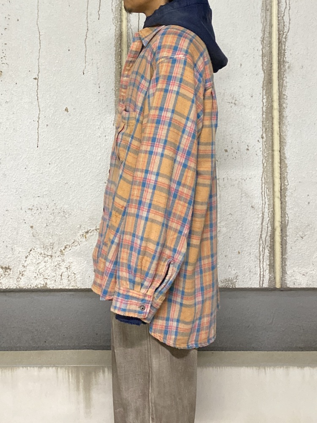 1980年代頃のアメリカのネルシャツを踏襲し、ゆったりと仕立てたワークシャツ。ありそうでなかったカラーバランスを目指し、組み合わせを様々に広げたパレットから厳選したオリジナルのヘビーフランネルを製織。原色の濃度を強めのフェードで落ち着かせさらに2色を載せることで彩度を整えました。格子の大きさまで細かく調整し多くの時間をかけて実現したチェックです。生地厚に秋冬らしい厚みと重みを持たせ、コットンらしいしっとりとした肌当たりとワーク由来の逞しい表情を表現しております。最終加工で職人が一点一点手作業で加工し長年使い込んだようなムードに仕上げました。古着のようで古着にはない表情。古い空気感に斬新さを宿らせたムード。是非、お試しください。日本製。