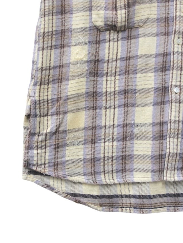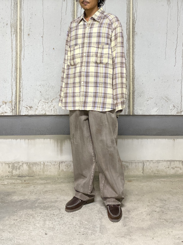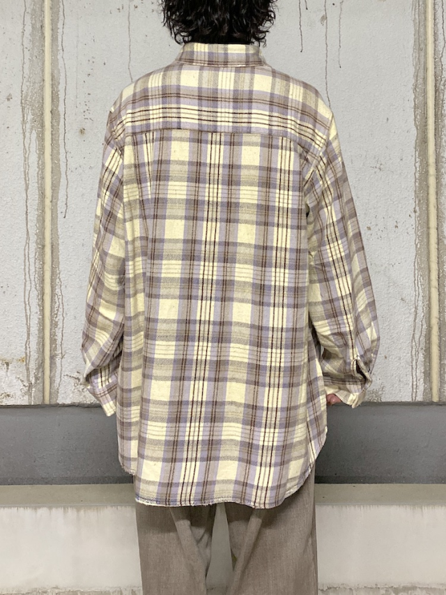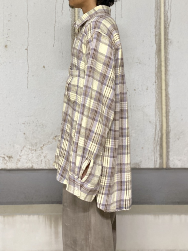 This work shirt follows the relaxed fit of American flannel shirts from the 1980s. We aimed for a color balance that felt familiar yet novel, weaving an original heavy flannel from a carefully curated palette that broadens combination possibilities. We tempered the intensity of the primary colors with a pronounced fade, then added two more hues to balance the saturation. The check pattern, meticulously adjusted down to the size of the squares, took considerable time to achieve. The fabric boasts a substantial thickness and weight perfect for fall and winter, delivering cotton's characteristic soft, smooth feel against the skin alongside the rugged character inherent to workwear. In the final finishing stage, artisans meticulously hand-process each piece individually, imparting a mood reminiscent of years of wear. It possesses the look of vintage clothing without actually being vintage. A mood that infuses old-world charm with a fresh, innovative spirit. We invite you to experience it for yourself. Made in Japan.