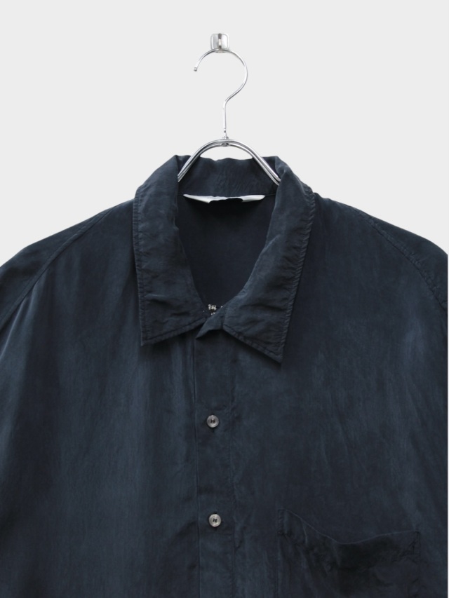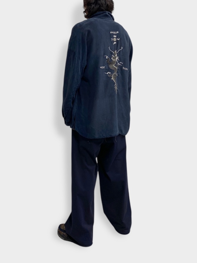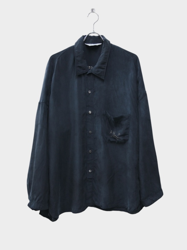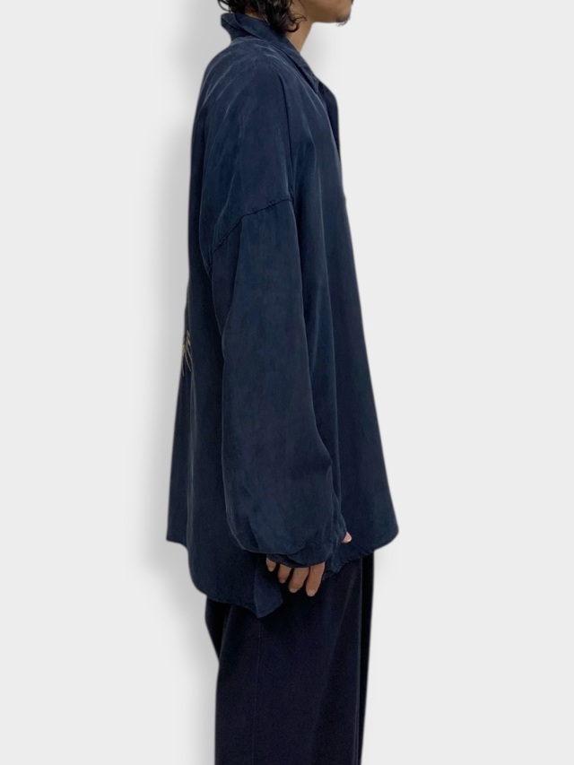 We reimagined vintage souvenirs for the modern era as ANCELLM. To capture the mood of an earlier, less developed time, we meticulously crafted each piece by hammering on coarse, uneven embroidery, carefully adjusting every detail—from the fabric's warping to the fine wrinkles created by the tension. Choosing cupra as the material provided a moist, elegant sheen, a soft touch, and functionality for warmer seasons. The fabric trembles and sways, beautifully fluttering in the breeze. However, embroidering on such supple fabric requires high skill, and finding the perfect balance proved quite challenging. We applied color in the finishing process, creating depth within the sheen to emphasize the overall mood. After much trial and error, it became a piece made with our whole heart. Please give it a try. Made in Japan.