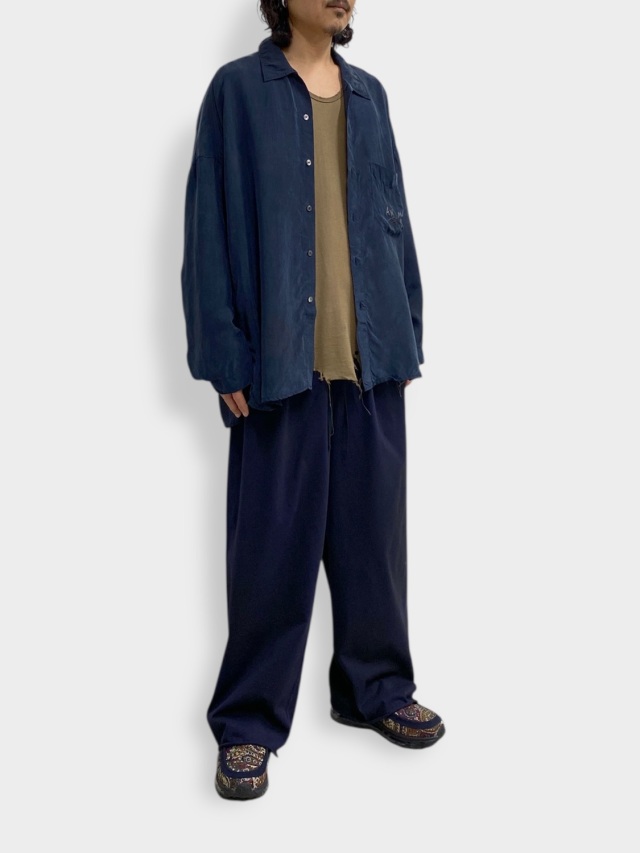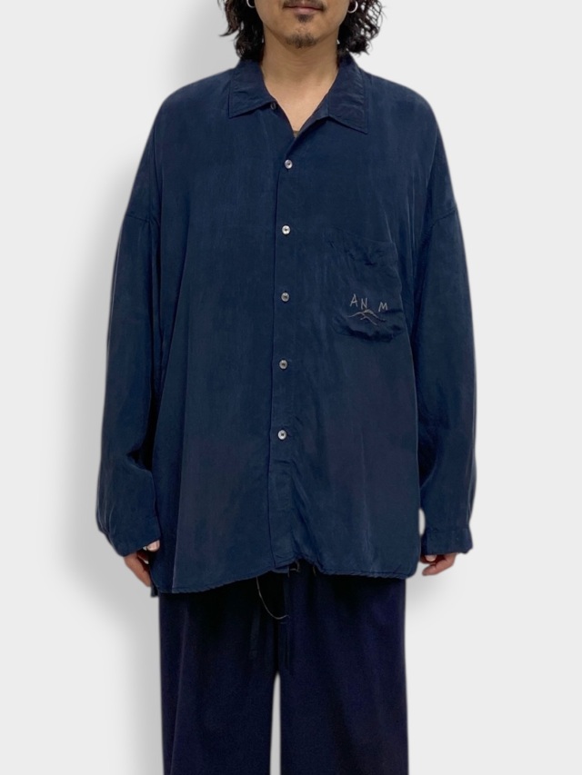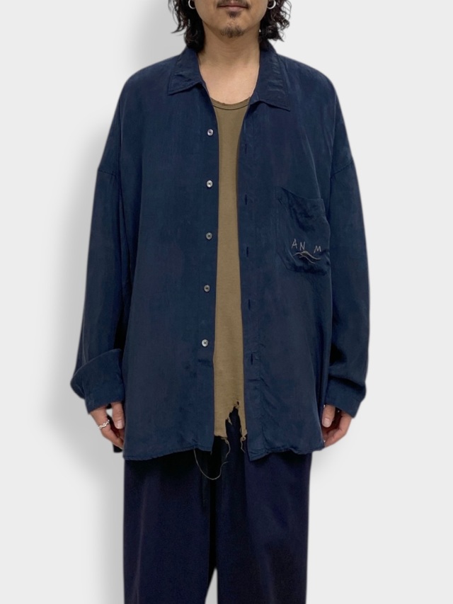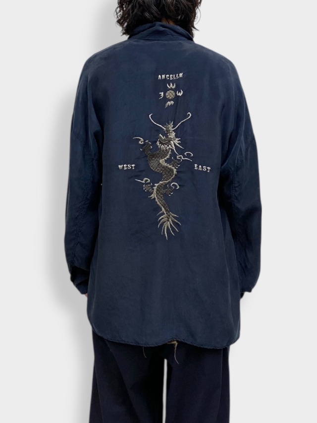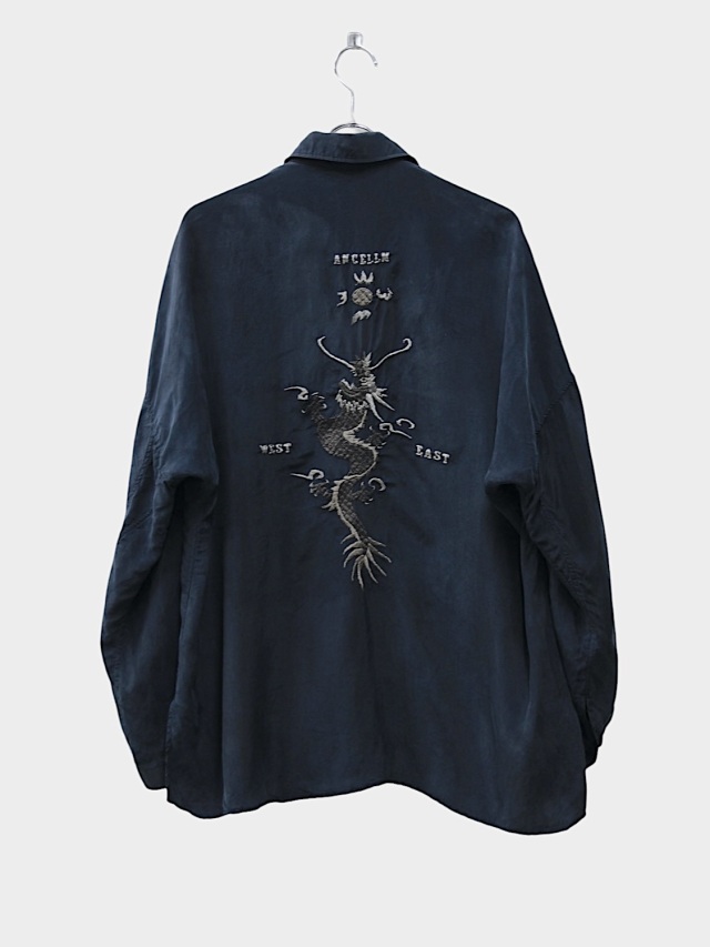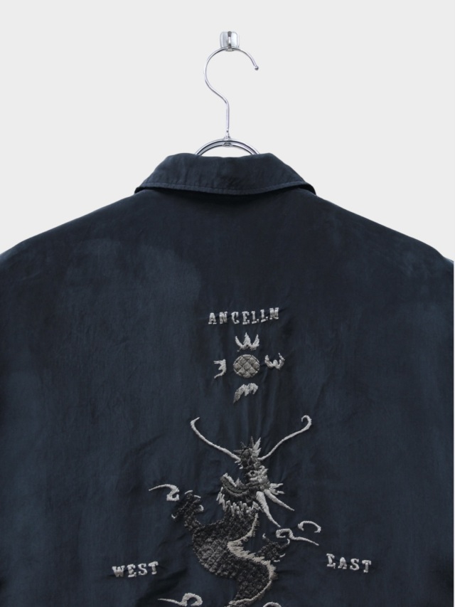 VINTAGEのスーベニアを現代に置き換えANCELLMとして表現しました。古い時代の未発達なムードを込めたく、粗く不揃いな刺繍を叩き、その張力で現れる生地のヨレや細かな皺まで細かく調整しながら製作しております。素材にはキュプラを選ぶことで水気のある上品な艶と柔らかなタッチ、暑い季節における機能性を備えました。プルプルと震えるように揺れ、風を受けて美しく靡く素材です。一方でこういったしなやかな生地に刺繍を叩くには高い技術が必要で、良い塩梅を探すのに随分苦労しました。フィニッシュで色付けを行い、艶やかな中にも奥行きを設け、全体のムードを強調しております。試行錯誤の末に渾身の一枚となりました。是非、お試しください。日本製。