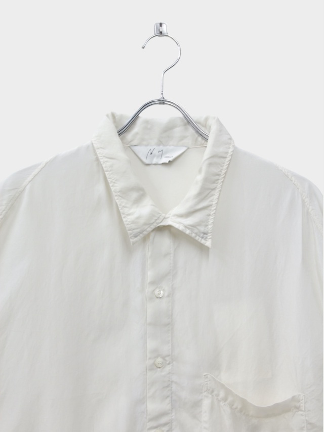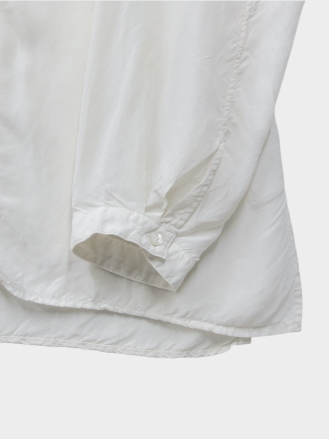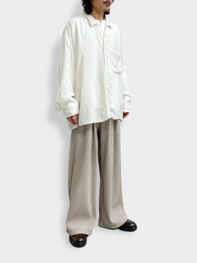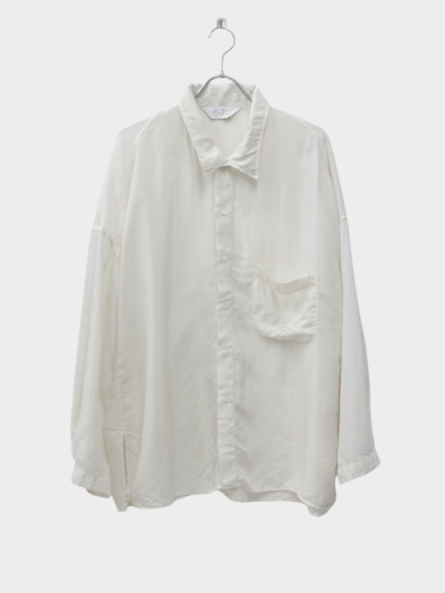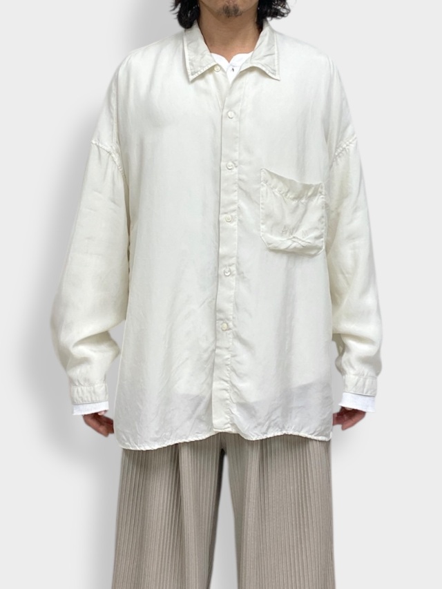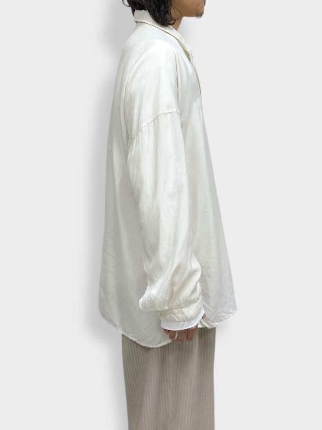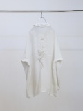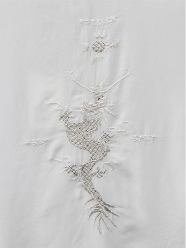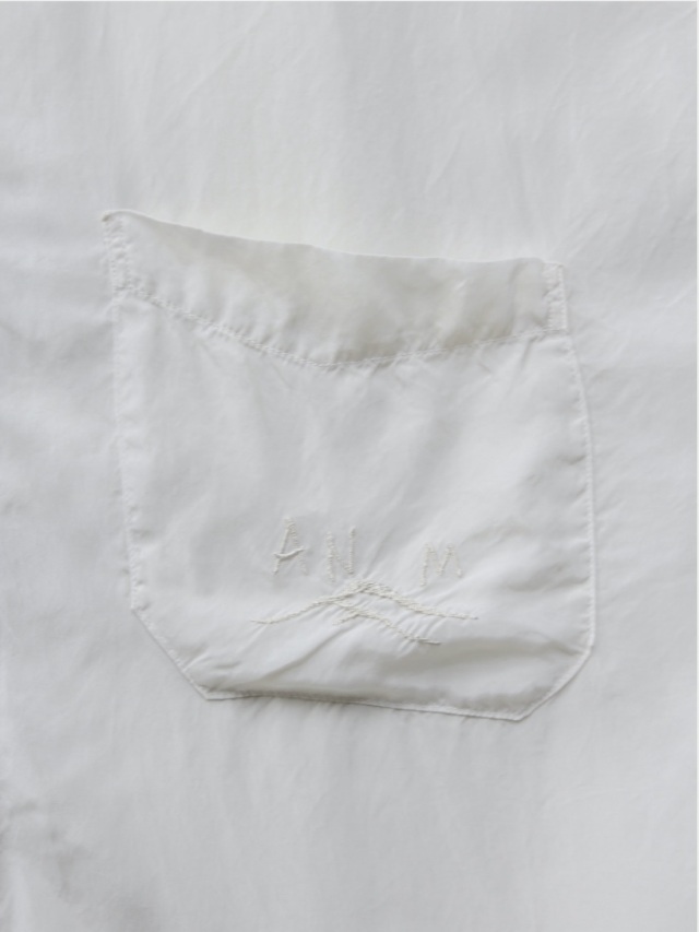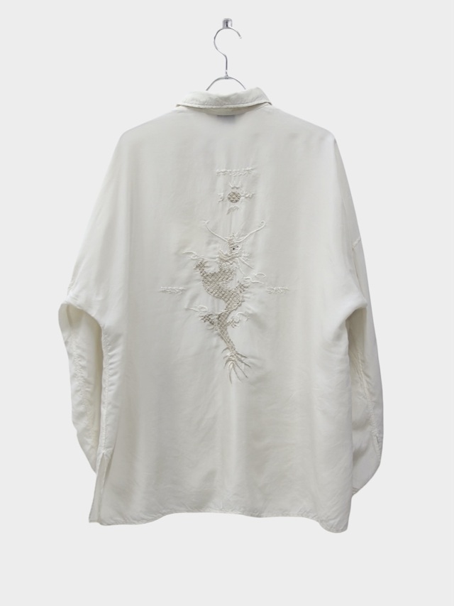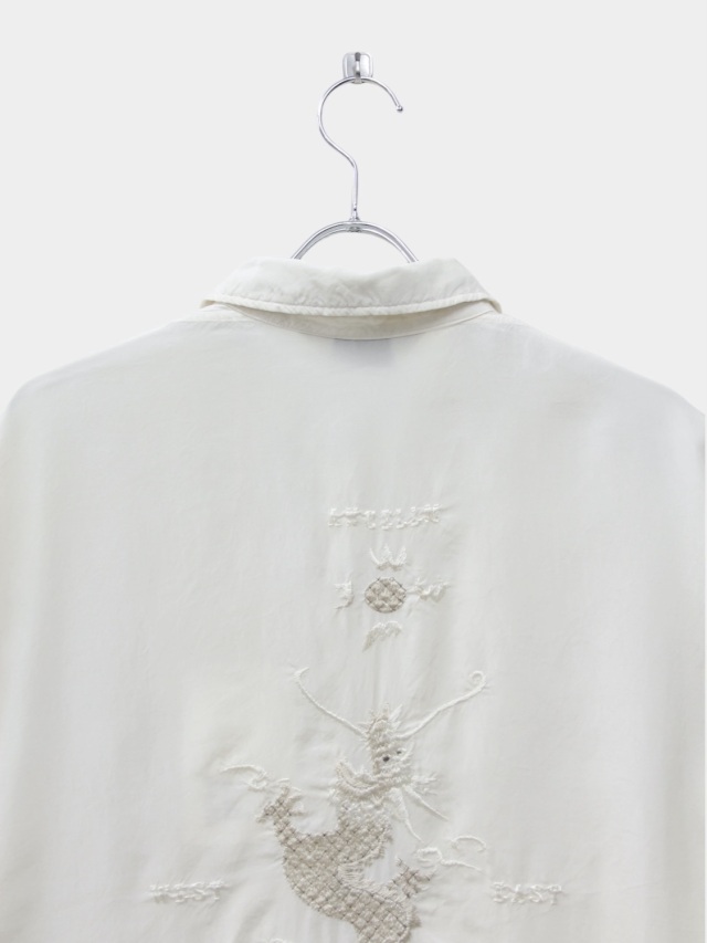 VINTAGEのスーベニアを現代に置き換えANCELLMとして表現しました。古い時代の未発達なムードを込めたく、粗く不揃いな刺繍を叩き、その張力で現れる生地のヨレや細かな皺まで細かく調整しながら製作しております。素材にはキュプラを選ぶことで水気のある上品な艶と柔らかなタッチ、暑い季節における機能性を備えました。プルプルと震えるように揺れ、風を受けて美しく靡く素材です。一方でこういったしなやかな生地に刺繍を叩くには高い技術が必要で、良い塩梅を探すのに随分苦労しました。フィニッシュで色付けを行い、艶やかな中にも奥行きを設け、全体のムードを強調しております。試行錯誤の末に渾身の一枚となりました。是非、お試しください。日本製。