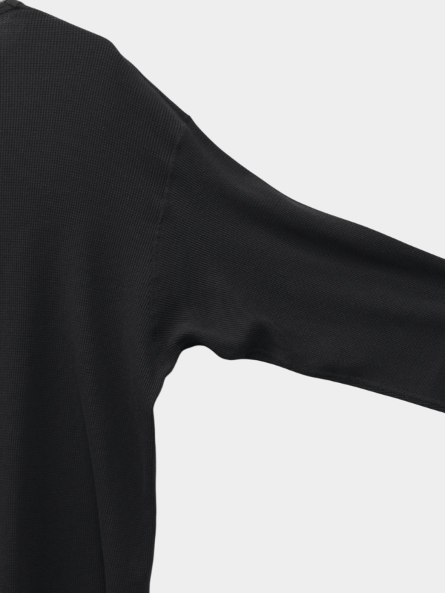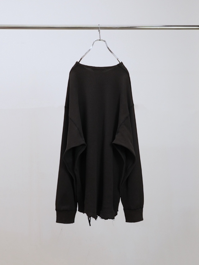 The DAMAGE WAFFLE remains our standard base layer for ANCELLM. This season, we offer two colors the staple WHITE and the limited edition D.BROWN. Its relaxed, longer fit allows the damaged hem to peek out from layered tops. We meticulously adjust the balance of holes by hand, aiming for damage at the hem and cuffs that catches the eye without being overly conspicuous. Though a staple, this piece never ceases to be challenging to produce. Yet, we're truly delighted that so many customers consistently incorporate it into their layered looks with other ANCELLM pieces. Since this is meant to be worn next to the skin, it's sewn with flatlock seams. This distributes the seam pressure across the skin, creating a comfortable, non-irritating feel. Additionally, waffle fabric is highly elastic it shrinks when washed and stretches when worn. It truly develops character with use, so we hope you'll enjoy the subtle changes each wear brings, nurturing it damage and all over time.