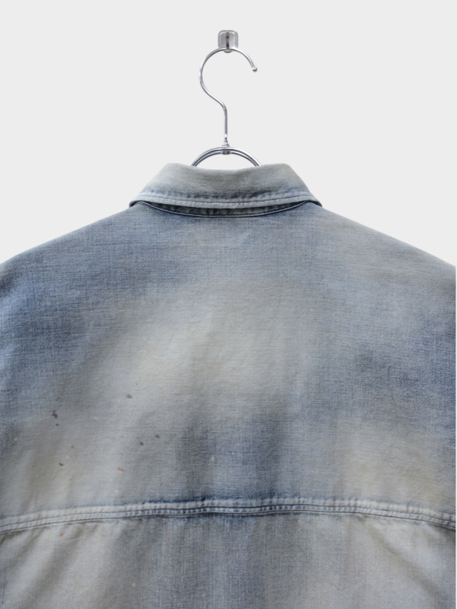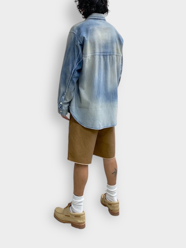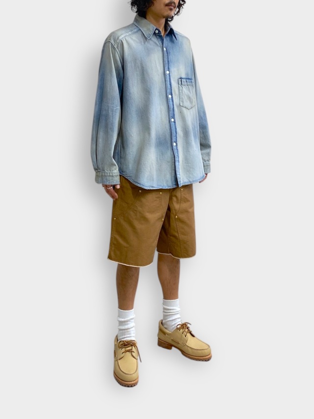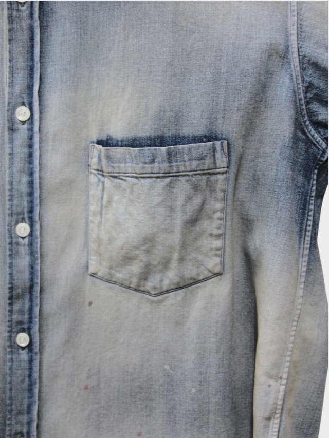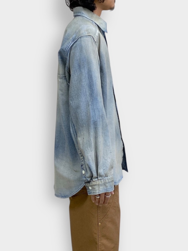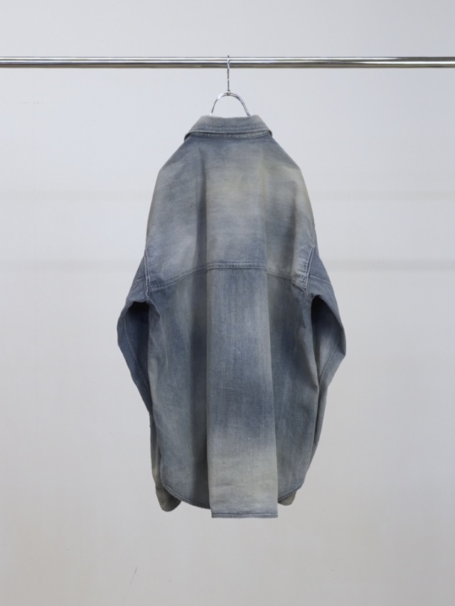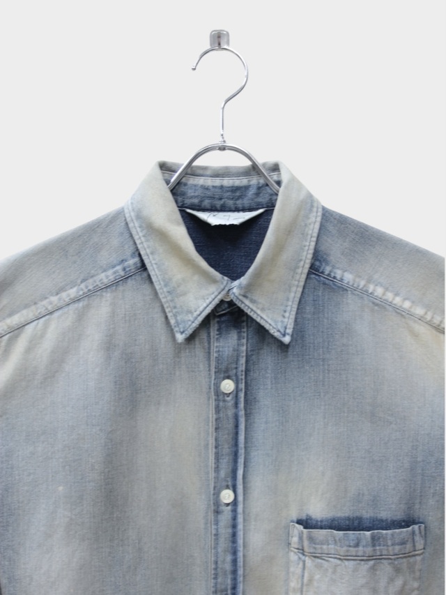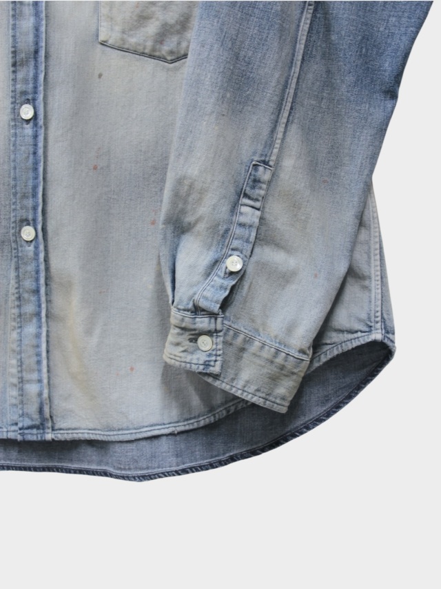 デニムを使用しながらドレスの概念を取り入れ、綺麗な雰囲気で着られるように製作したデニムシャツ。あっさりと着られるベーシックさを目指しながらも、いかにANCELLMとしてのキャラクターを宿らせるか。何度も足し算と引き算を繰り返して製作しました。生地量を多めに取りながらもパターンで綺麗に収め、衿を開いたときに仄かな色気が出るようVゾーンを調整。ゆるやかな肩落ちや前方に流れる袖作りなど、どの角度から見ても美しく映るように設計しております。水彩画のようなぼんやりと滲んだ色を出したく、INDIGO/BLACKでは明度を高めながらも奥行を作りました。職人が一点一点に手作業で加工を入れることで生地や色合いに表情を持たせた渾身の仕上がりです。着古すだけでは現れない美しいグラデーションをご覧ください。日本製。