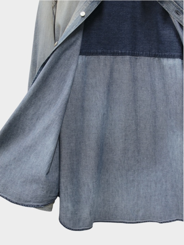This denim shirt incorporates the concept of a dress while using denim, crafted to be worn with an elegant feel. While aiming for a basic, easy-to-wear simplicity, we repeatedly added and subtracted elements to imbue it with ANCELLM's character. We used a generous amount of fabric yet tailored it cleanly through patternmaking, adjusting the V-zone to reveal a subtle allure when the collar is open. Features like gently dropped shoulders and sleeves that flow forward are designed to look beautiful from every angle. For the INDIGO/BLACK color, we aimed for a watercolor like, softly blurred effect, increasing brightness while creating depth. Each piece is meticulously finished by hand, giving the fabric and color tones a unique character. Experience the beautiful gradient that only time and wear can truly reveal. Made in Japan.