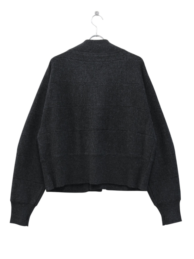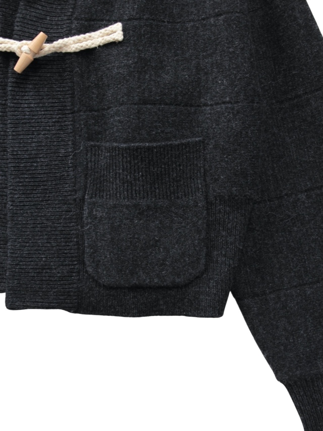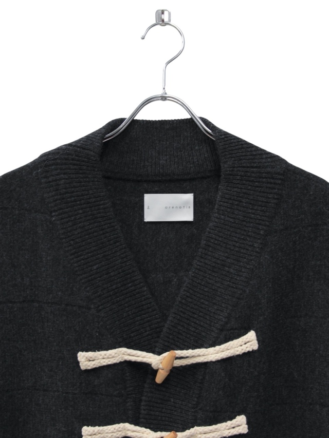 This needle-pull cardigan is knitted using yarn blended with deodorizing mugwort fibers and pure wool that offers a pleasant feel and excellent warmth retention. Lightweight and non-itchy, it features a substantial, textured knit that makes a statement even as a basic piece. Its short length and voluminous sleeve cut, expressed through the knit, create a signature arenotis silhouette that commands attention even in quiet moments. The front features toggle buttons, reminiscent of those used on duffle coats, allowing for layered styling with coats and other pieces to create a story. It also includes finger holes, offering warmth and a mood perfect for this season.