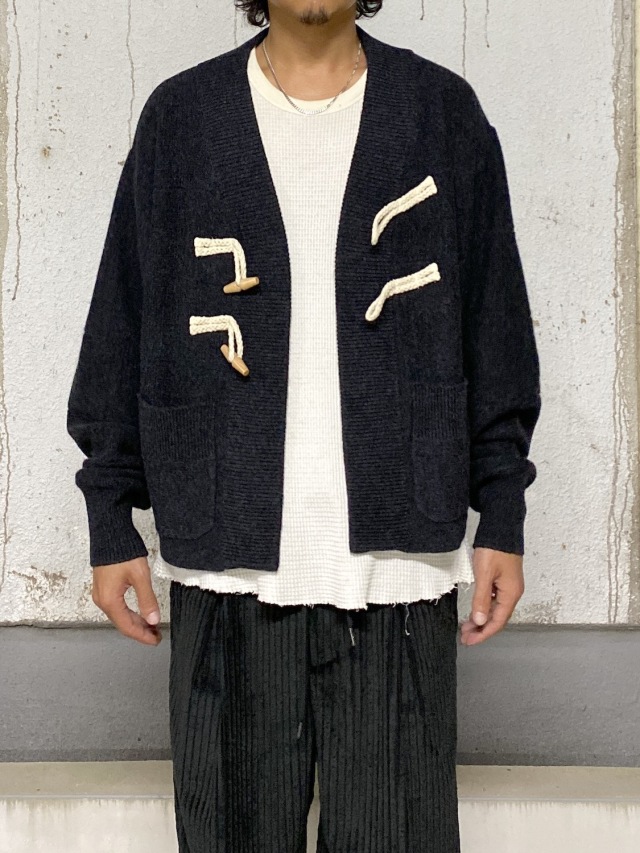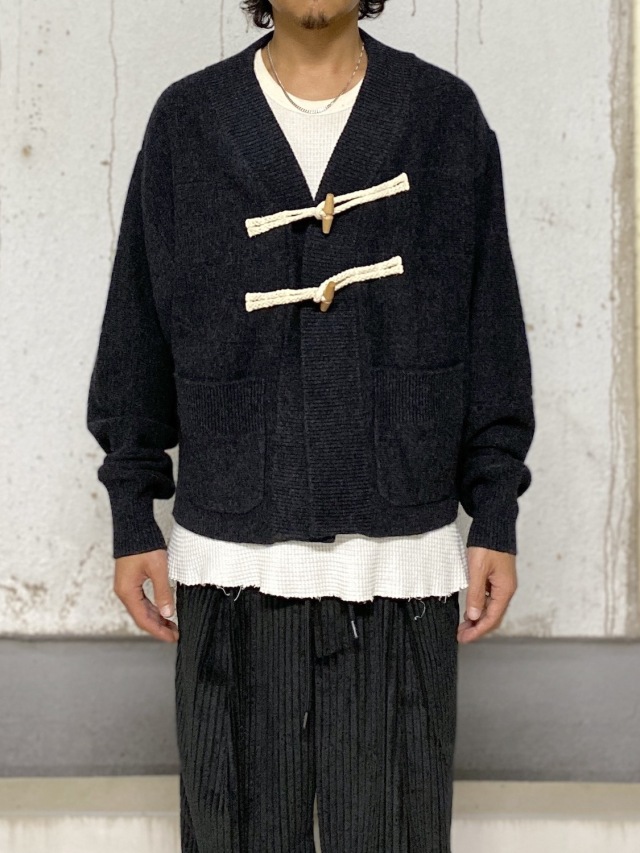 消臭効果のあるヨモギの繊維を織り交ぜた糸と手触りの良く保温性の高いピュアウールを引き揃えて編み上げた針抜きカーディガン。軽くチクチクせず、ベーシックながらも単品でも様になる存在感のある肉感、編み地となっております。ショート丈でスリーブにボリュームのあるカッティングをニットで表現した静寂の中にも存在感のあるarenotisらしいシルエットになっております。フロントはダッフルコートで使用するトグルボタンを配し、コートとのレイヤードなどストーリーのあるスタイリングをお楽しみいただけます。またフィンガーホールもついており防寒と今シーズンらしいムードをお楽しみいただけます。
