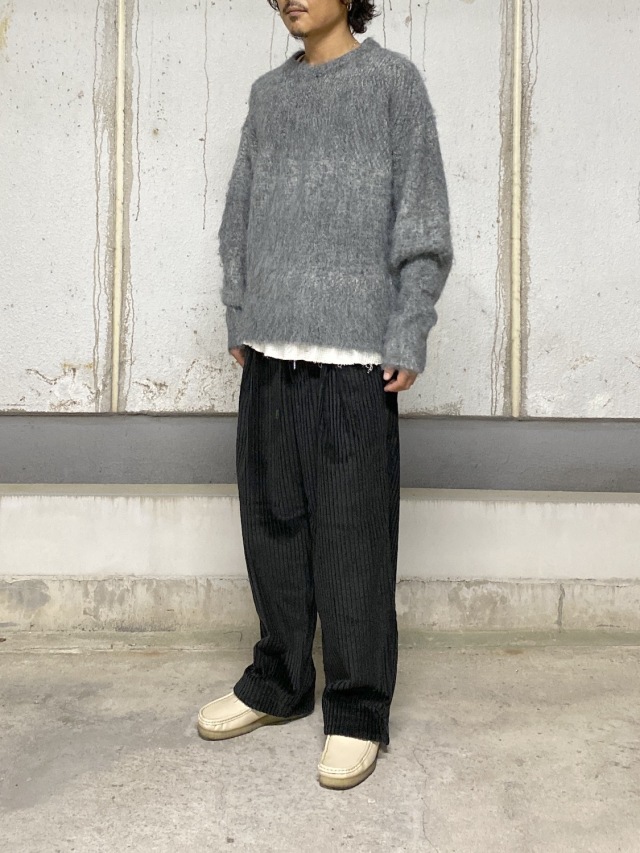 A pullover featuring shaggy yarn with a pile and gradient-dyed yarn. The pile that touches the skin is crafted from wool and alpaca yarn, creating a soft, warm-feeling garment. A gradient pullover featuring delicate expression through varied knit patterns on the front chest. The sleeves showcase voluminous cutting expressed through knitwork, creating an arenotis-signature silhouette that commands presence even in quiet moments. Seams are intentionally exposed, allowing reversible wear with a non-fuzzy design (laundry tag included). Finger holes are also incorporated, offering warmth and a distinctly seasonal mood.
