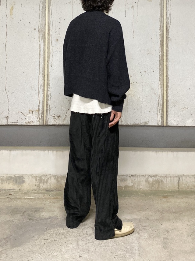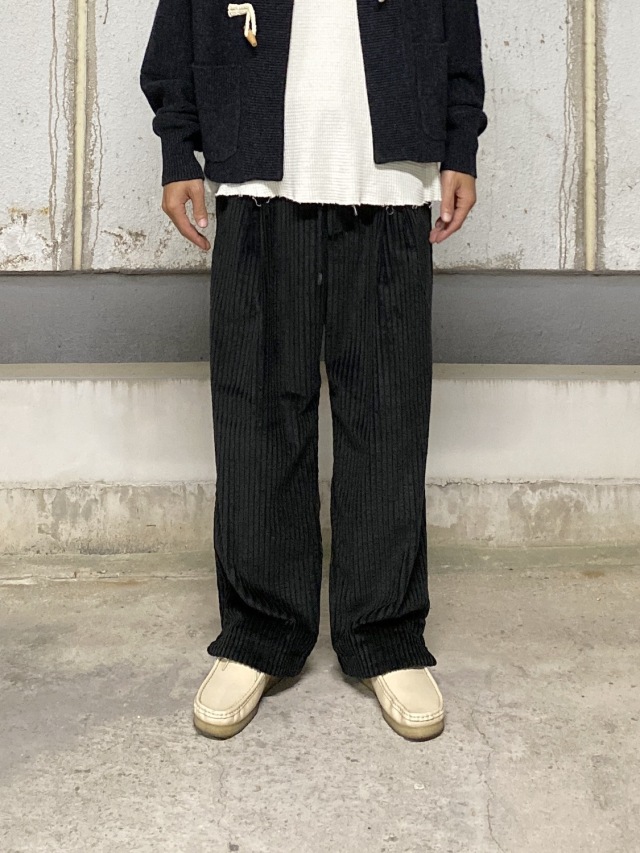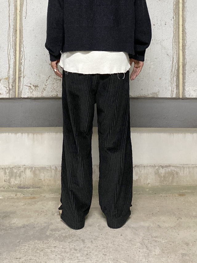 国内でも数少ない織機でしか織れない珍しい極太の3ウェルコーデュロイを使用。存在感のある激太の縦線はスタイリングのアクセントとなり微光沢でふんわりとしてモールのような表面感のはカジュアルにもドレッシーにも着こなせる一本となっております。前身に深いレイヤードされたタックを入れ、歩くと膝があたりタックが開きバルーンのようなシルエットで閉じている時はすとんと落ちたスラックスのようなシルエットとなっております。股上を深めにとることでウエスト位置をお好みの位置でご着用いただけルーズな印象にも、ハイウエストでロールアップしてソックスを見せていただくのもおすすめです。アジア人の体型に合ったヴィンテージのトラウザーズを数本分解し、前身と後身をそれぞれ抽出し再構築し独自のシルエットを作成しました。裾には小さくスリットをあしらい、フロントは2本のタックを重ねイレギュラーなボリュームを付けたワイドシルエットパンツとなっております。