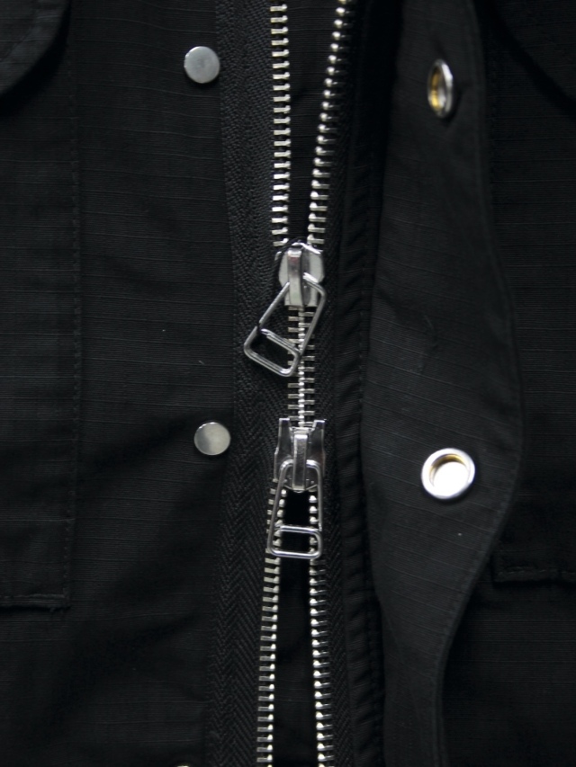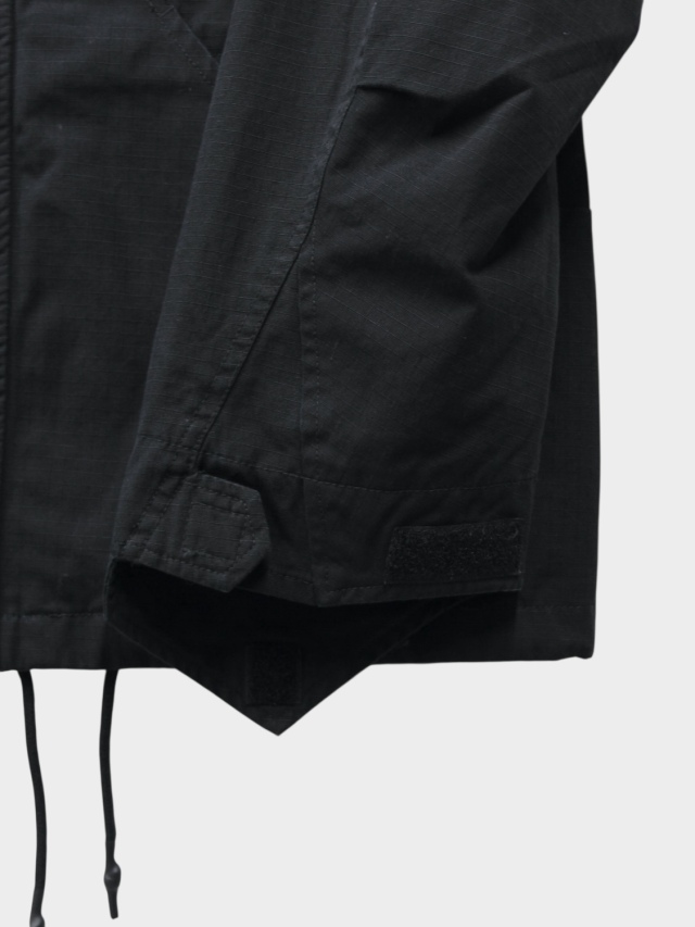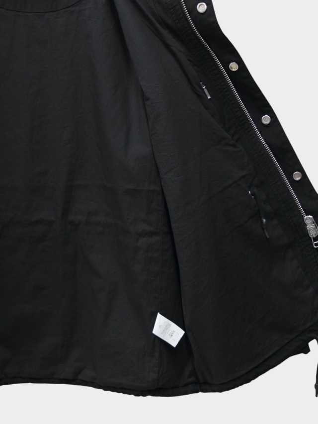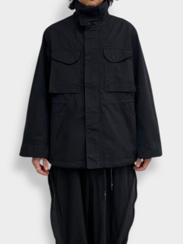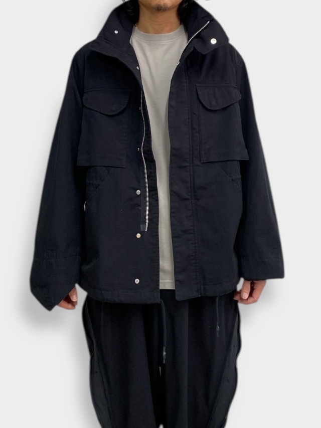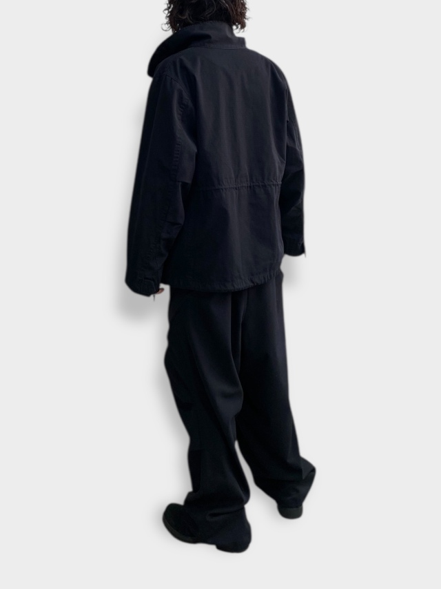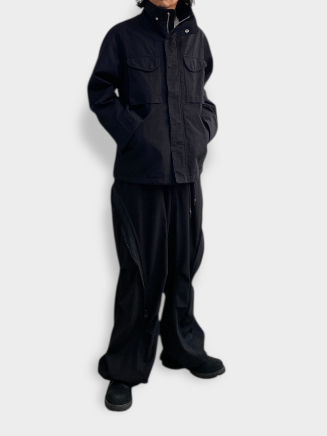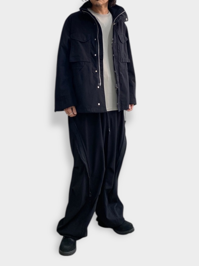Based on the M-65 field jacket, this utility piece features large curved pockets on both sides, embodying the quintessential bal aesthetic. It boasts an IDEAL double zipper and a fly closure with snap buttons. Drawstrings at the waist and hem allow for silhouette adjustment. A post-production wash finish lends it a distinctive, lived-in look.