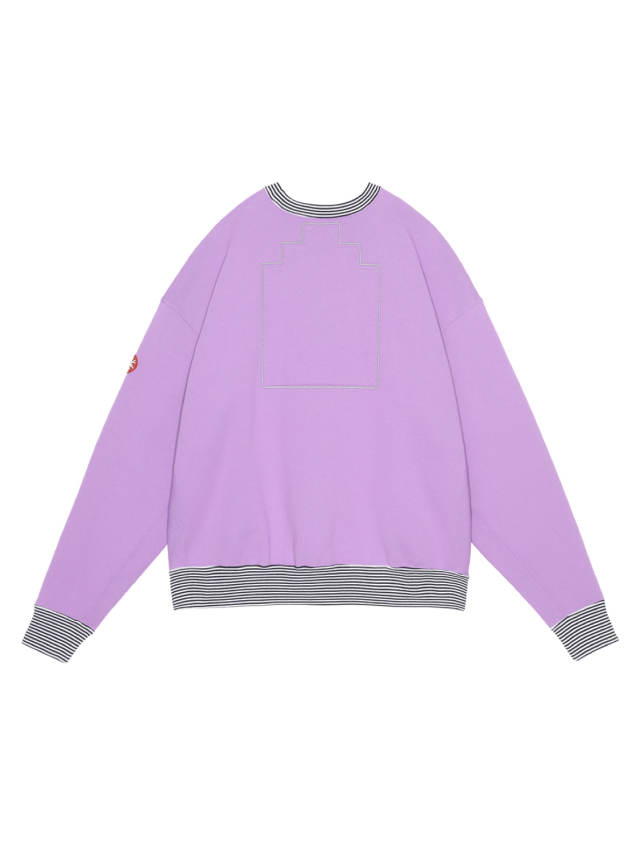 100% cotton. Sweatshirt fabric. Pullover. Crew neck. Set-in sleeves. Fabric patch on back panel lining. Reflective print on back panel exterior. Silicone patch on upper left sleeve. Striped ribbing at collar, cuffs, and hem. Fabric change at underarm and sides. Wide silhouette. Washed finish. Made in Japan.