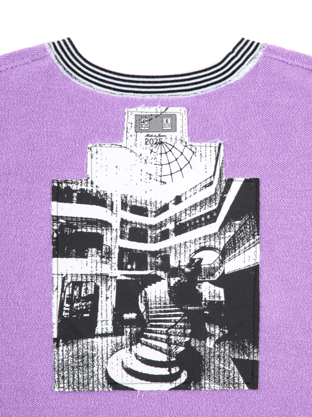 100%コットン。スウェット生地。プルオーバー。クルーネック。セットインスリーブ。後ろ身頃裏に布パッチ。後ろ身頃表にリフレクタープリント。左袖上部にシリコンパッチ。襟、袖口、裾にストライプリブ。袖下、脇で生地切り替え。ワイドシルエット。ウォッシュ加工。日本製。