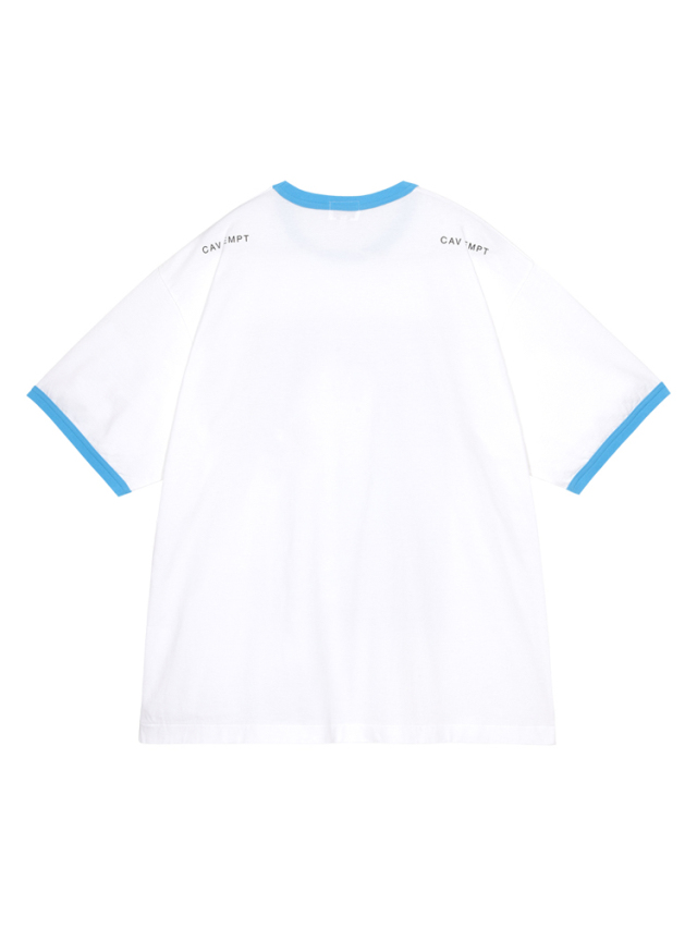 100%コットン。薄手天竺生地。プルオーバー。クルーネック。前身頃にグラフィック。後ろ身頃ショルダーにCAV EMPT。襟、袖口で色・生地切り替え。ビッグシルエット。ウォッシュ加工。日本製。