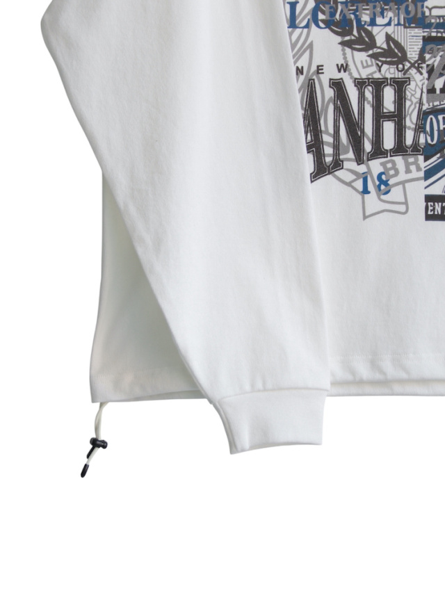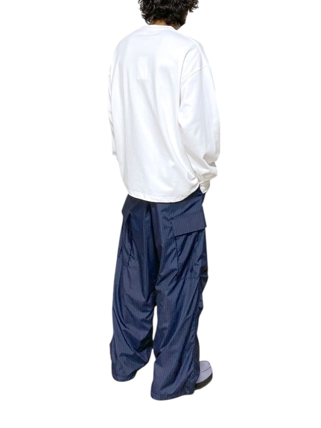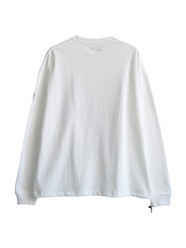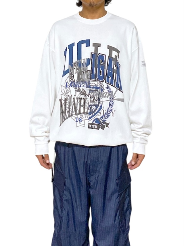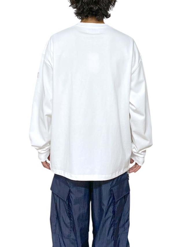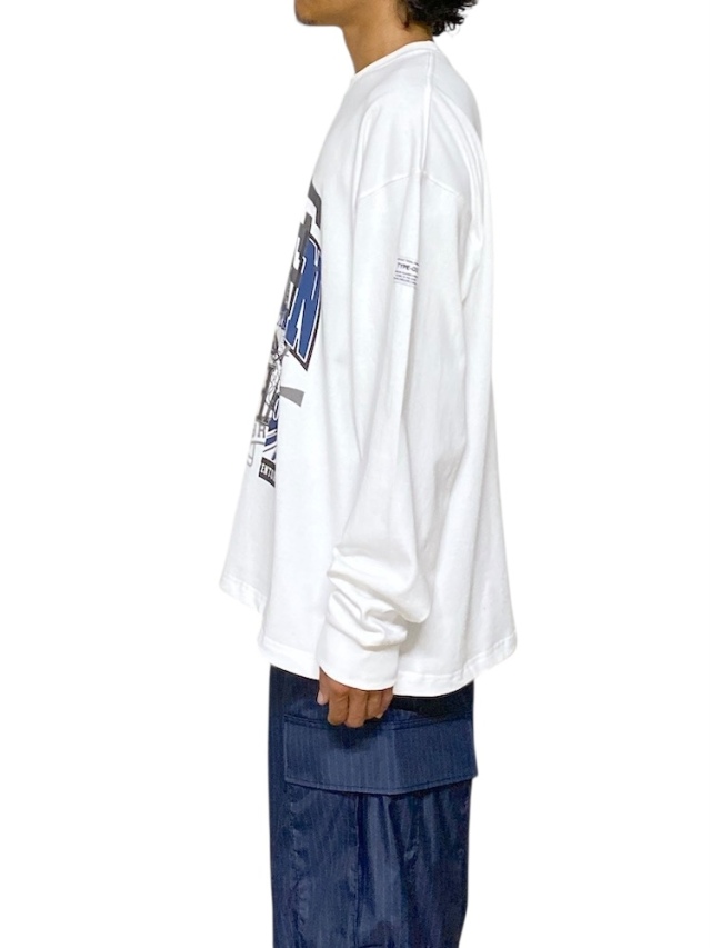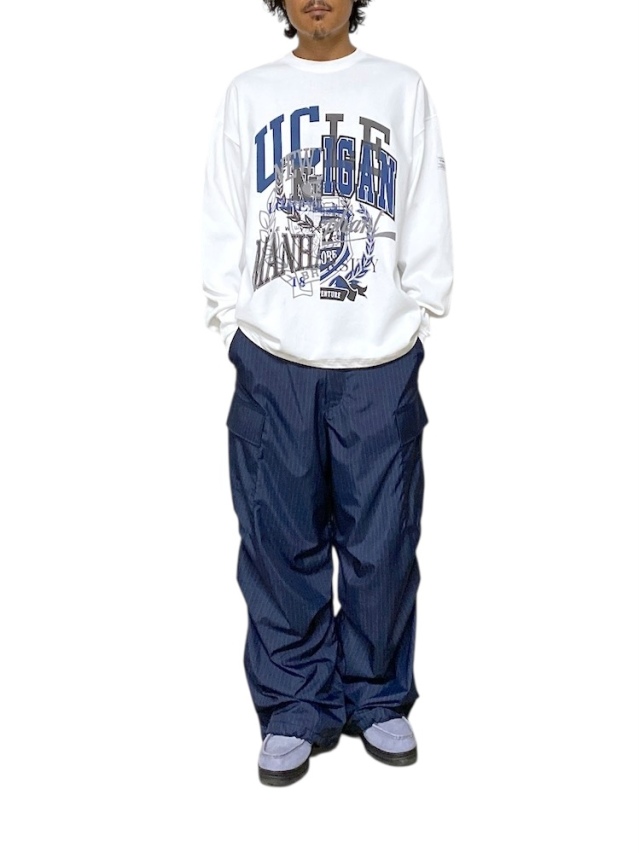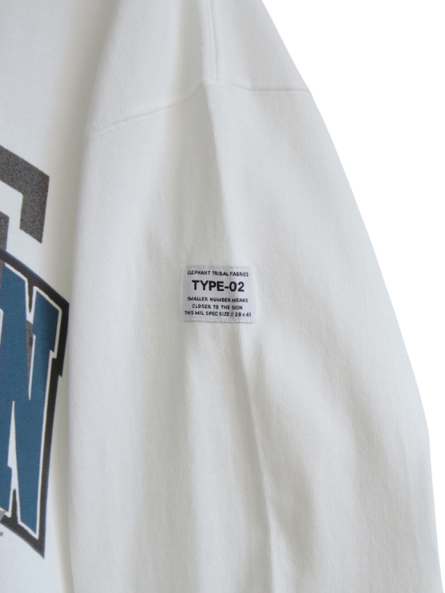 ゆったりとしたサイズ感で定番展開されるFATシリーズ。今作は多種類のカレッジグラフィックをのせたグラフィックロンT。ボディには強撚糸を使用したシャリ感のあるヘビーオンスな生地を採用。身幅にゆとりを持たせたボックスシルエット。裾部分にはアジャスター付きドローコードを配置しシルエット変更が可能。