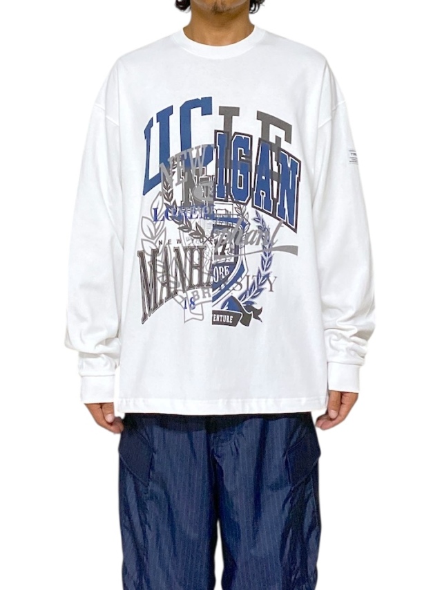 The FAT series features relaxed sizing in its staple lineup. This release is a graphic long-sleeve T-shirt adorned with a variety of college graphics. The body uses a heavy-ounce fabric with a crisp texture, made from high-twist yarn. It boasts a boxy silhouette with generous width. An adjustable drawcord at the hem allows for silhouette customization.