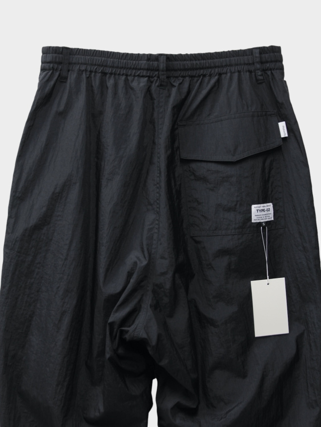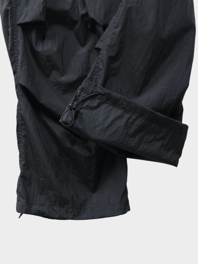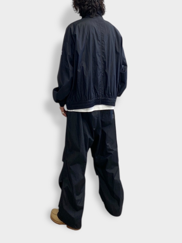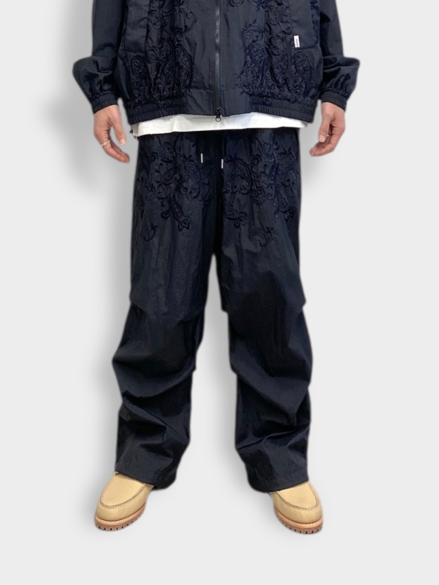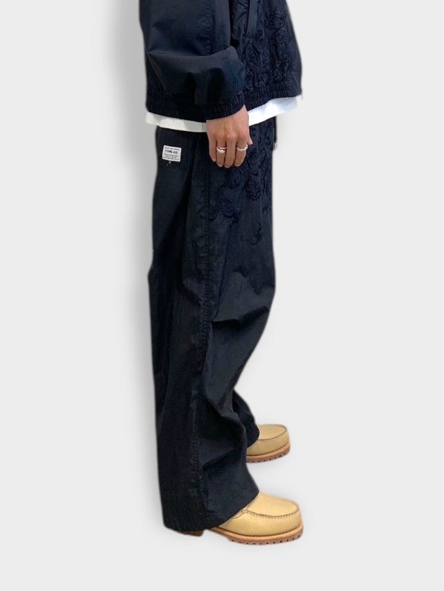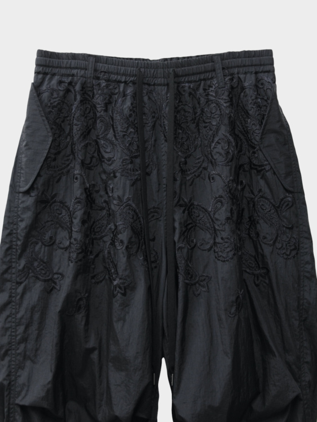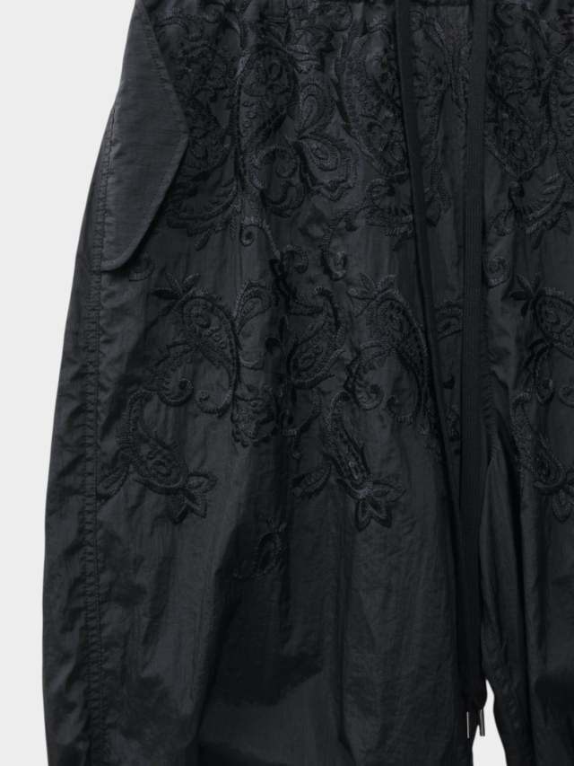 定番でリリースしているSNOW CAMO PANTS。本来は付いていないポケット袋布やベルトループをプラスし、スノーカモパンツをタウンユース用に落とし込みました。今季はウエスト上部から下部にかけてペイズリー刺繍を配置。表地は、ワッシャー加工を施した撥水性に優れたナイロン素材を使用。肌離れを良くするために裏地には、吸水性・速乾性に加え、静電気の発生を抑える制電糸を使用した、ドライタッチの細かいメッシュ素材を採用。イージーパンツ仕様。スピンドル配置。裾部分にもシルエット変更出来るようドローコードを配置。