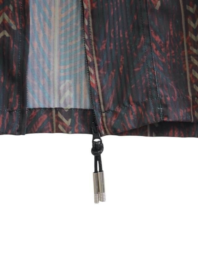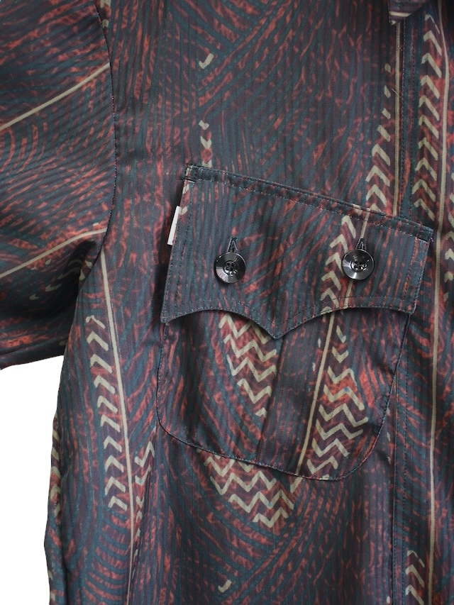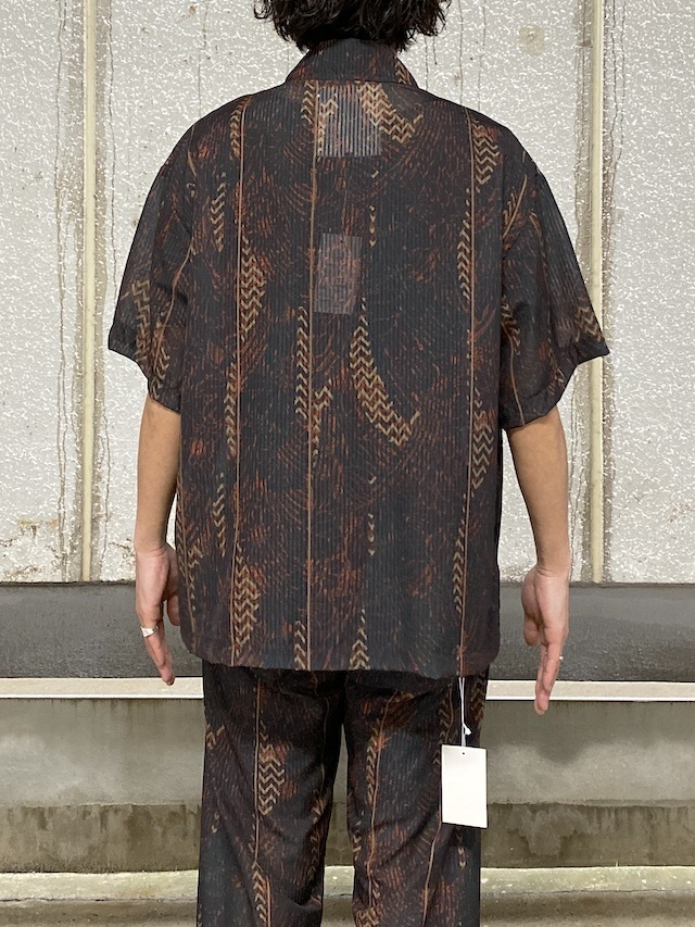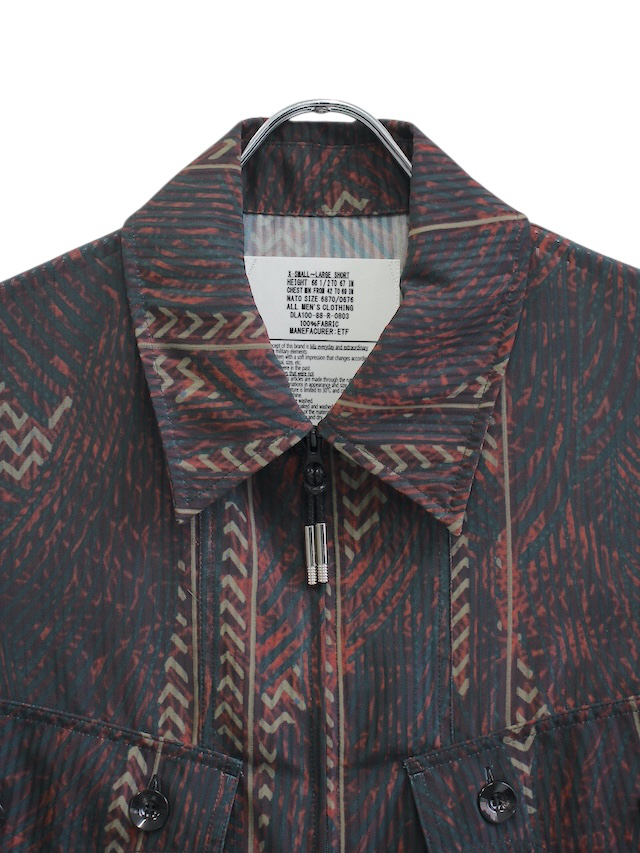 定番でリリースしているNO A/C(エアコン)シリーズ。根をイメージしたトライバル風オリジナルテキスタイルを使用した透け感のあるジップシャツ。非常に軽やかでシャリ感があり、小さな穴が無数に開いているからみ織りの生地を使用。胸ポケット部分はファティーグジャケット1stタイプのポケットディティールを採用。フラップ部分はカモメ型に変更し、ミリタリーの持つ武骨さを柔らかな印象へアップデート。ファスナー引手にはレザーのドローコードを配置。タンクトップに合わせてサラッと、エアコン要らずな清涼感をお楽しみ下さい。同素材のイージーパンツE02-FP25Sと合わせてセットアップとして着用頂けます。