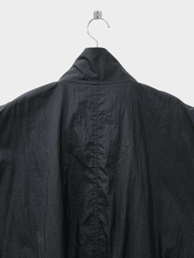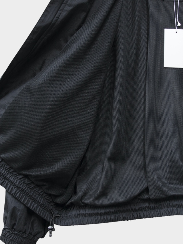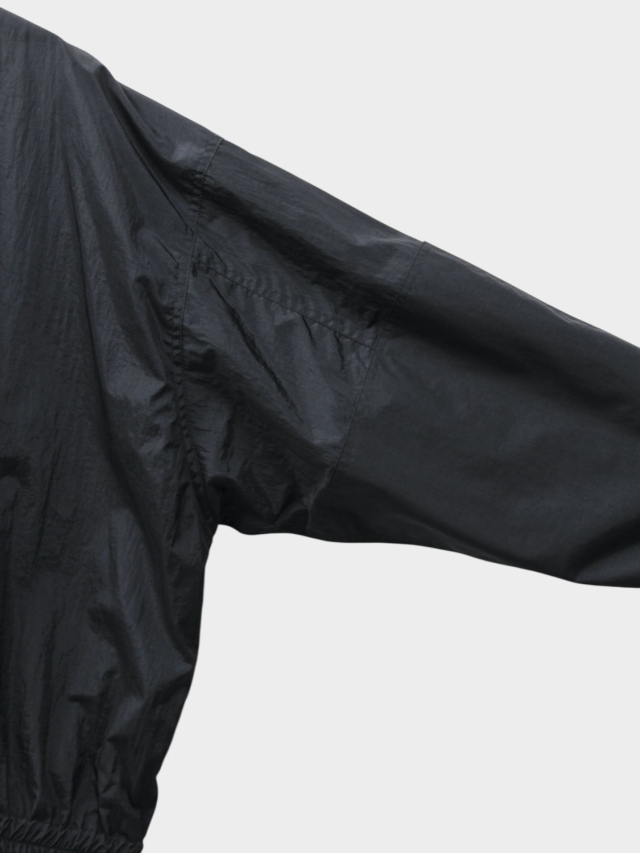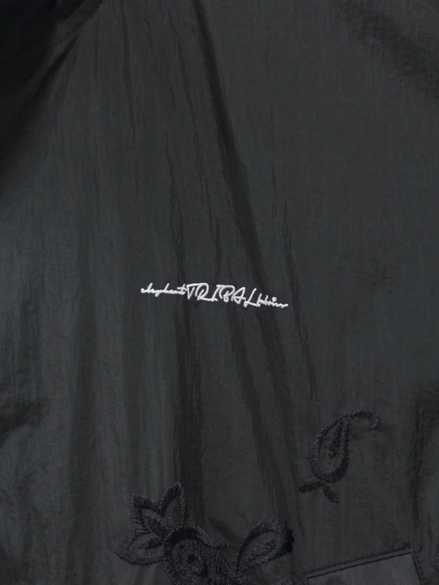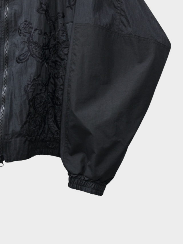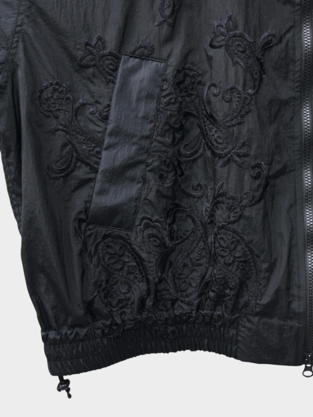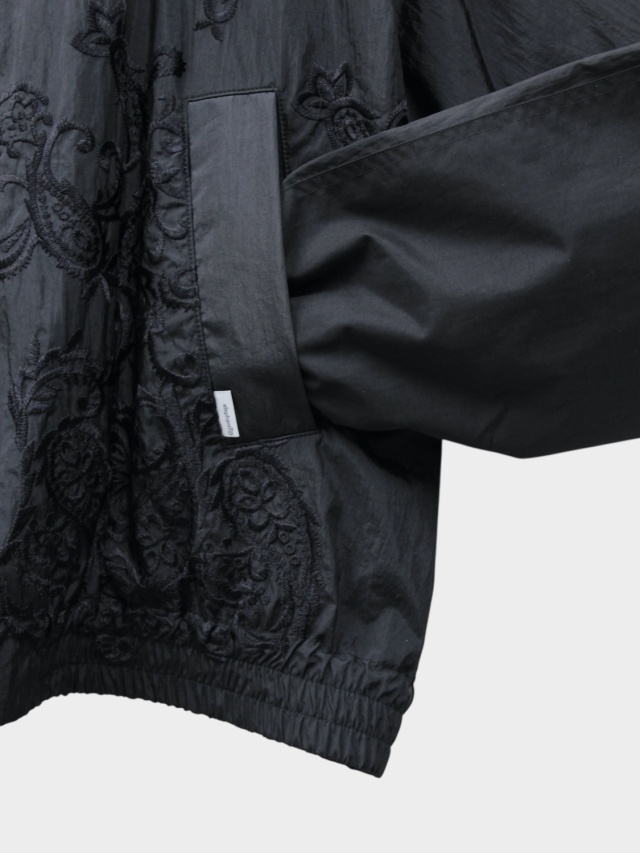 The FAT JAMPER, a staple in our releases. Its silhouette features an oversized chest, shoulders, and armholes paired with a shortened length for a boxy shape. This season, paisley embroidery runs from the center front to the hem. The chest bears the brand logo embroidery. The outer fabric uses a water-repellent nylon material treated with a wash finish. The lining employs a fine mesh fabric with a dry touch, utilizing anti-static yarn that suppresses static electricity, in addition to its moisture-wicking and quick-drying properties. An adjustable drawcord is placed at the hem, allowing for silhouette customization.