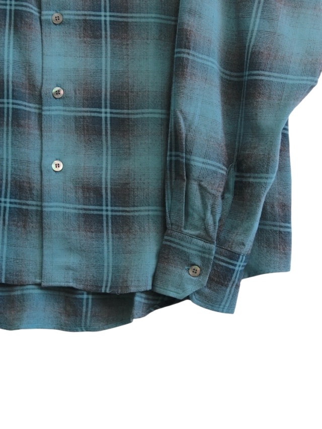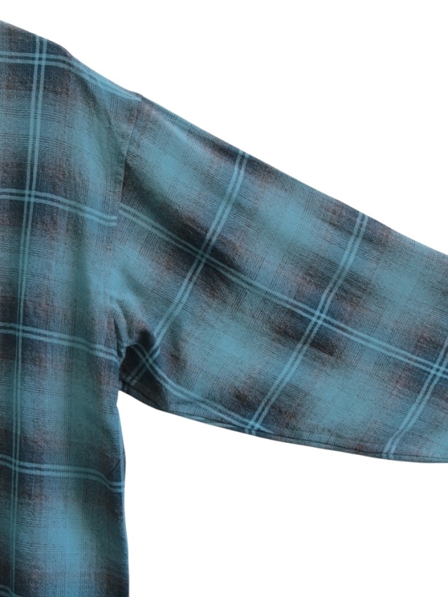 A vibrant ombre check shirt made from original check fabric. The silhouette is slightly loose for easy pairing. The fabric is made from three types of yarn with different shrinkage rates: wool, wool TOP, and rayon. Nylon is wrapped around the wool yarn to create a gauze-like texture, and the finished tumbler processing gives it a wrinkled look. With its dry touch and comfortable feel, this shirt is sure to be a staple for many seasons to come.made in Japan.