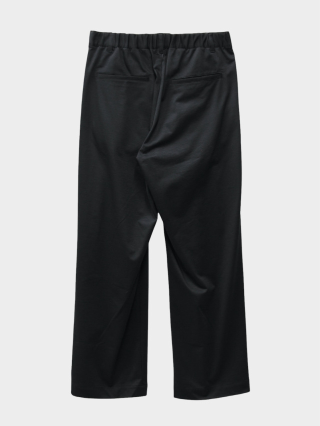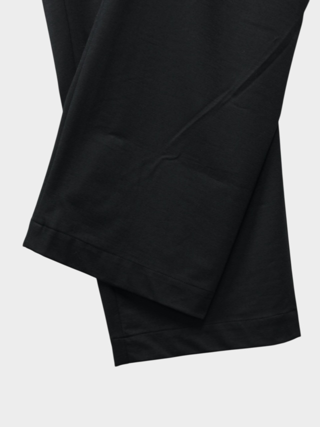 1年中着用できるウール素材。これぞカネマサなトラウザーを新素材で作成しました。36ゲージ特注丸編み機で高密度にタイプライター組織に編み立てました。この機械で編める最大限の細さの糸 1/60 super120ノンミュールジングウールと高い形態回復性・軽快なストレッチ性、圧倒的な軽さを持ち合わせるSolotex糸を交編させました。ウールの機能性(保温性、抗菌性)は維持されたまま、さらりとした肌さわりとニットのストレッチ性がある今までにないウール素材。もちろん家庭洗濯可能です。洗濯機でガシガシ洗ってください。洗いを繰り返すことでよる風合いが増していき、育てていくことができる素材。