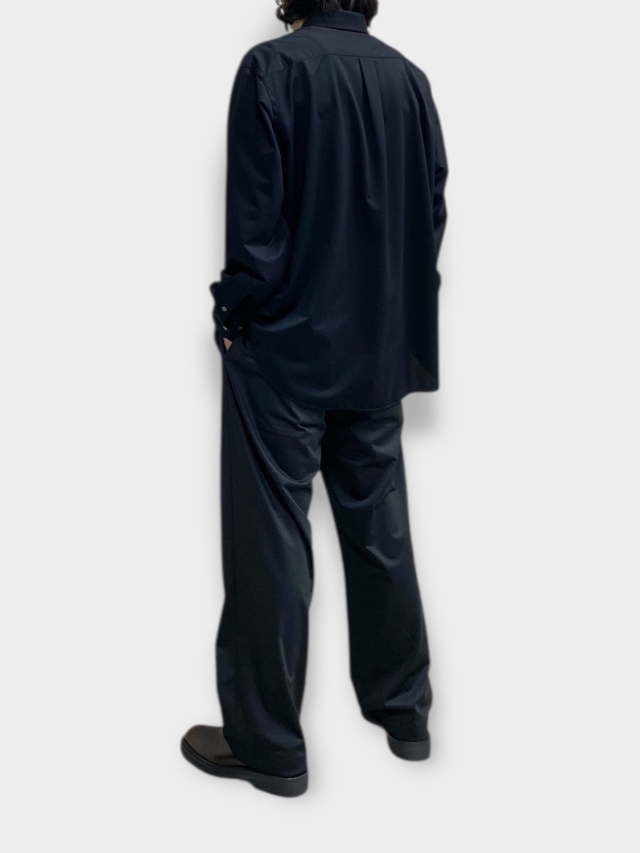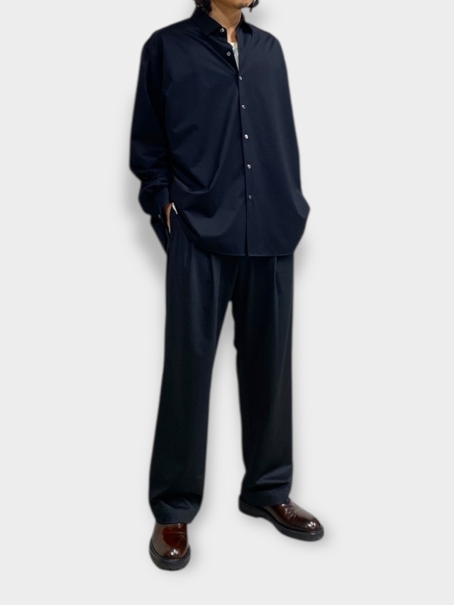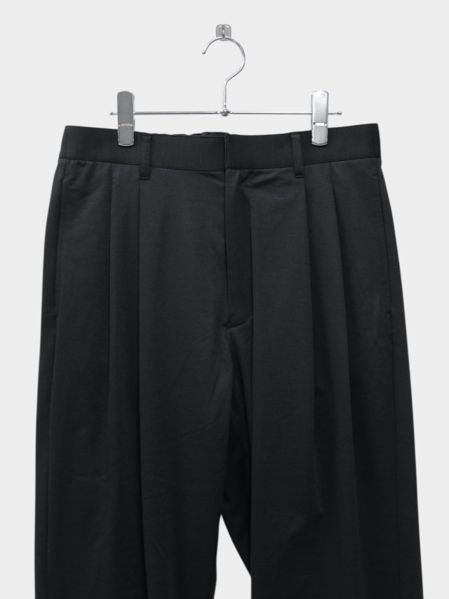 Slacks with a deep tuck. The straight silhouette with moderate armpits and lightly tapered legs is a characteristic of this item.
