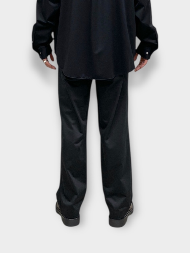 タックが深く入ったスラックス。わたりを程よくとり、軽くテーパードをかけたストレートシルエットが特徴です。フロントは、天狗仕様にて、ドレスな雰囲気にも仕上げております。どのようなシーンでも着用頂けるパンツです。