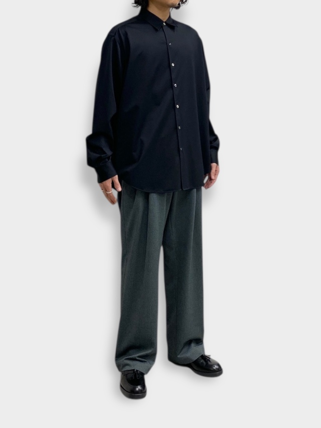 As the name “atmosphere” implies, this shirt has a relaxed silhouette and a standard silhouette with an easily recognizable material feel. 46G is a super high gauge, high-density plain weave fabric called “typewriter”. It has a super high gauge of 46G and a high-density plain weave structure called a typewriter. It is highly stretchable and once worn, it is unstoppable and comfortable, and it is also highly easy-care with little morphological change such as wrinkling when worn. This is a new standard shirt fabric that only we can produce, with a sense of firmness, luster, and easy care.