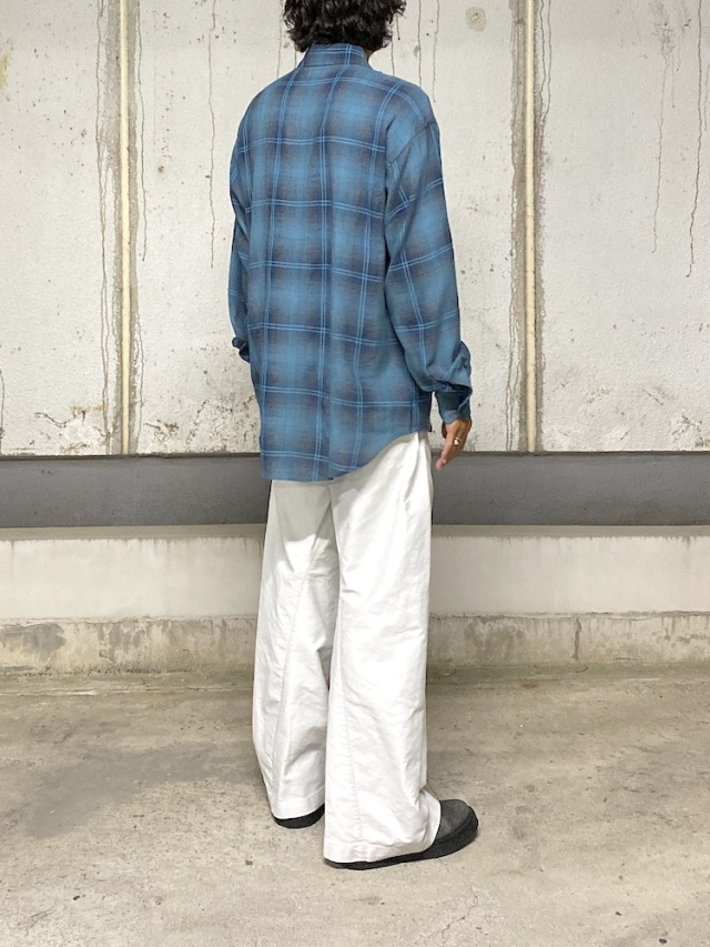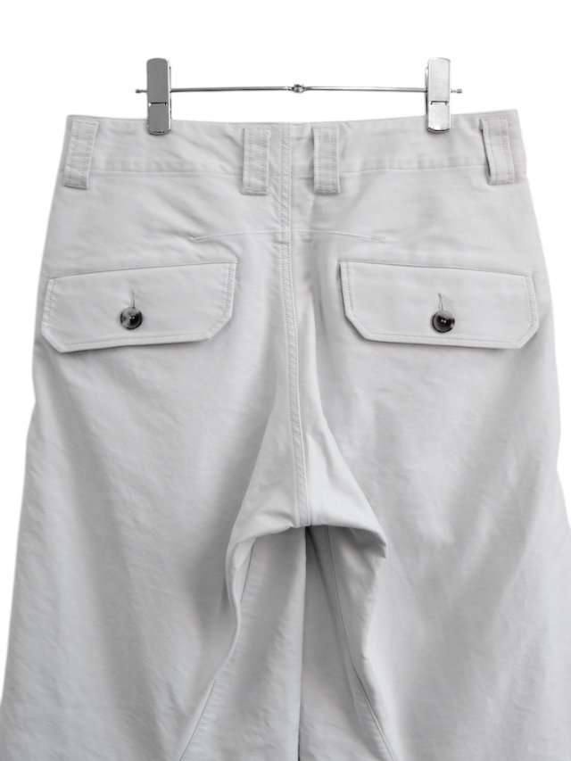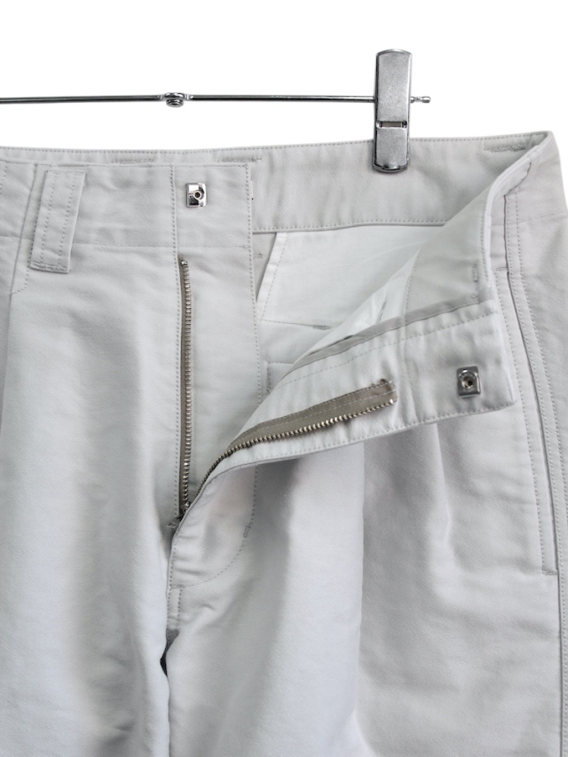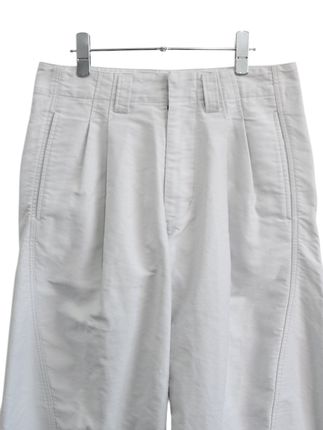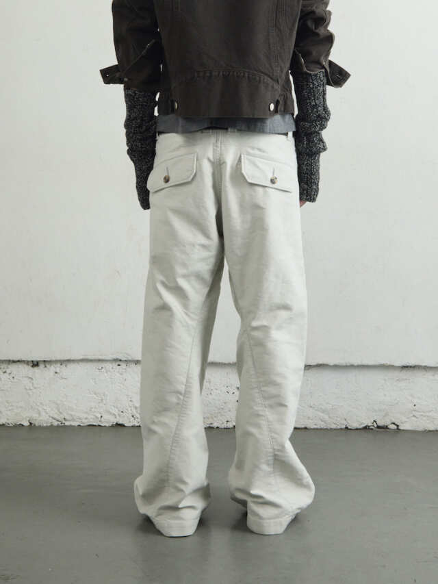 超高密度モールスキンを使用した2タックワイドレッグトラウザーズ。立体裁断を施しサイドシームが大きく捻じれたデザインが特徴です。ボールバイオウォッシュによるヴィンテージ加工仕上げ。日本製。