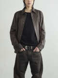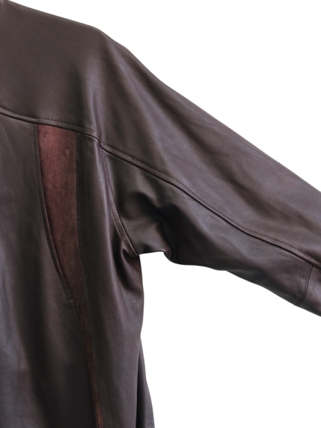 ベジタブルタンニンを施したゴートスキンを使用したレザーシャツ。比翼スナップ釦開き。半裏仕立て。ハの字状にスウェードレザーで切替えたパネリングデザインが特徴。NVRFRGTらしいパターンとシルエットが際立つ一着。前身頃両サイドのポケットはステルスで切替え部分に配し、ミニマルなデザインを強調しております。着込むほど風合いを増す経年変化もお楽しみ下さい。