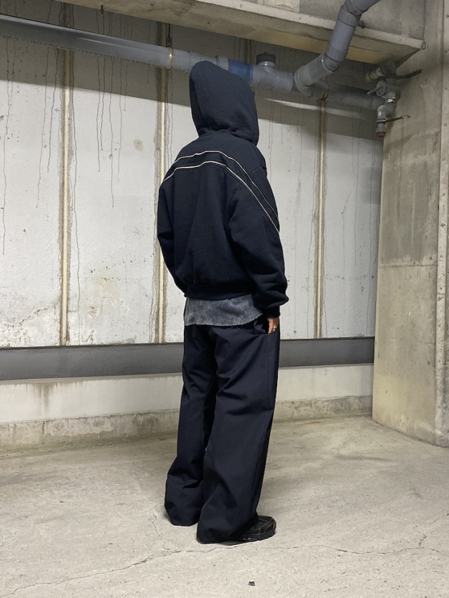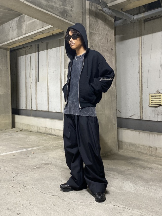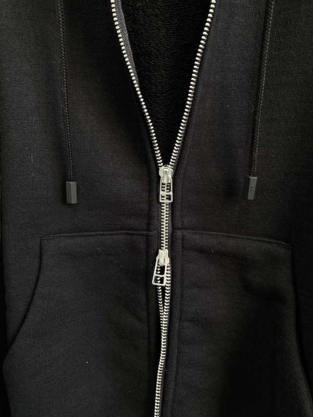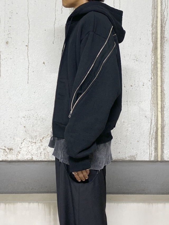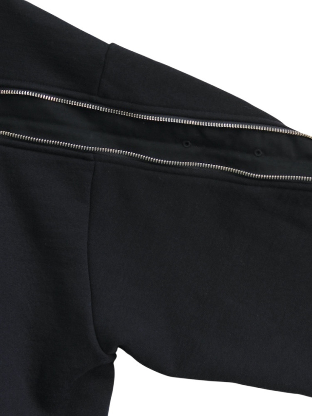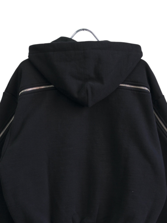 袖から背中まで繋がったジップが特徴のフルジップパーカー。FOAMORAというクッションのような柔らかさと、肉厚で心地よい着心地を持つオリジナル素材を使用。背中のジップを開閉することでシルエットを調整可能。身幅は広め、着丈は短めのシルエット。袖口のリブには指抜きを配している。日本製。