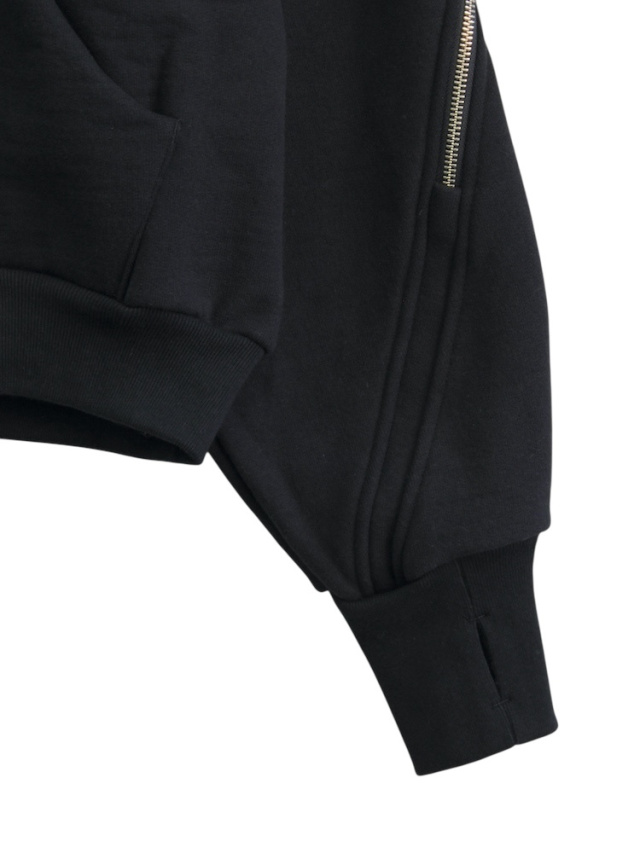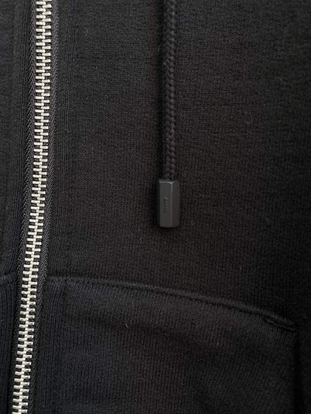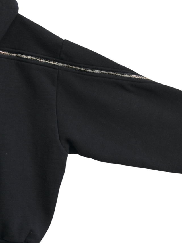 A full-zip hoodie featuring a zip that runs from the sleeve to the back. Made from an original fabric called FOAMORA, offering cushion-like softness and a thick, comfortable feel. Adjust the silhouette by opening or closing the back zip. Features a roomy body width and a slightly cropped length. The ribbed cuffs include thumbholes. Made in Japan.