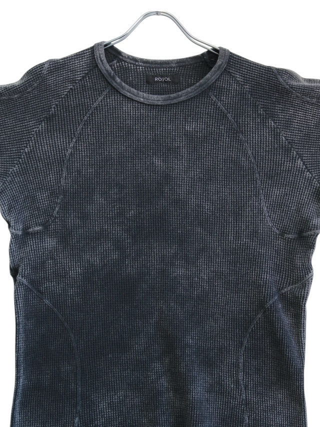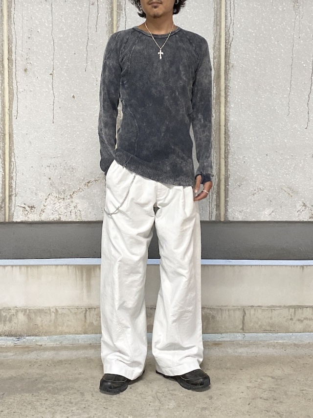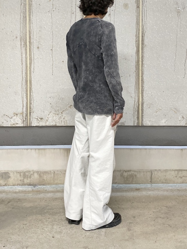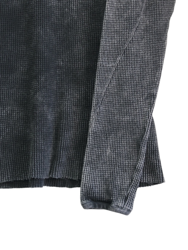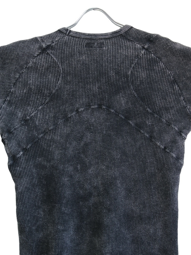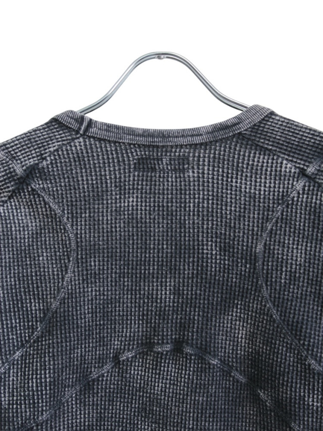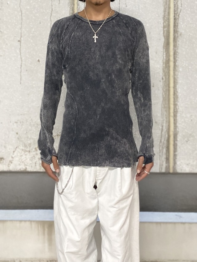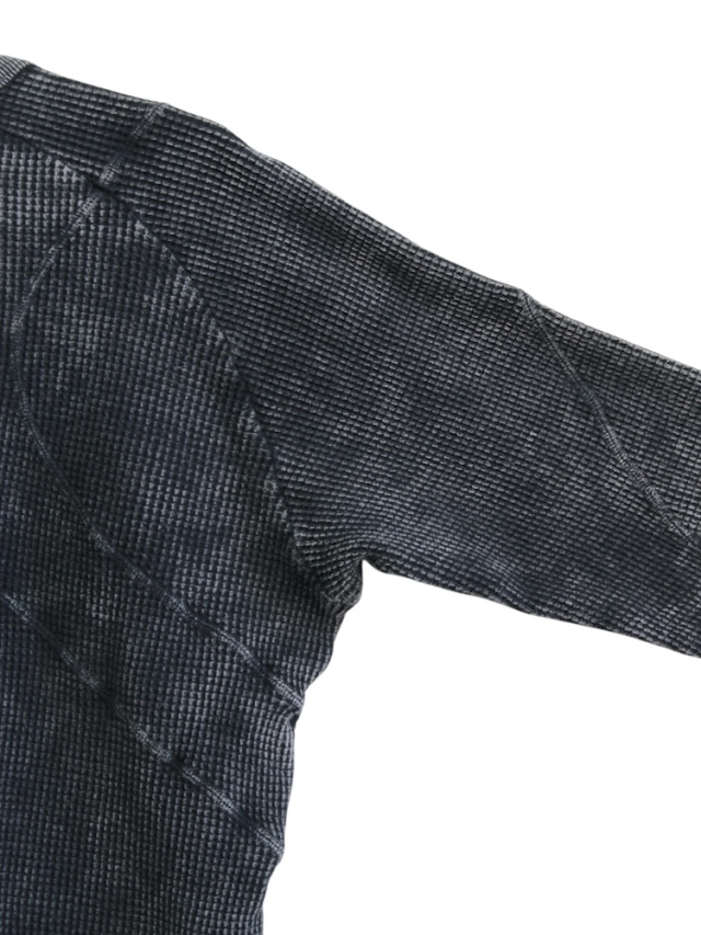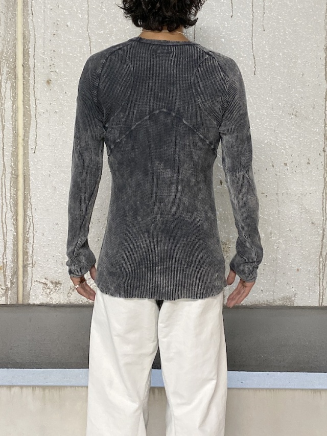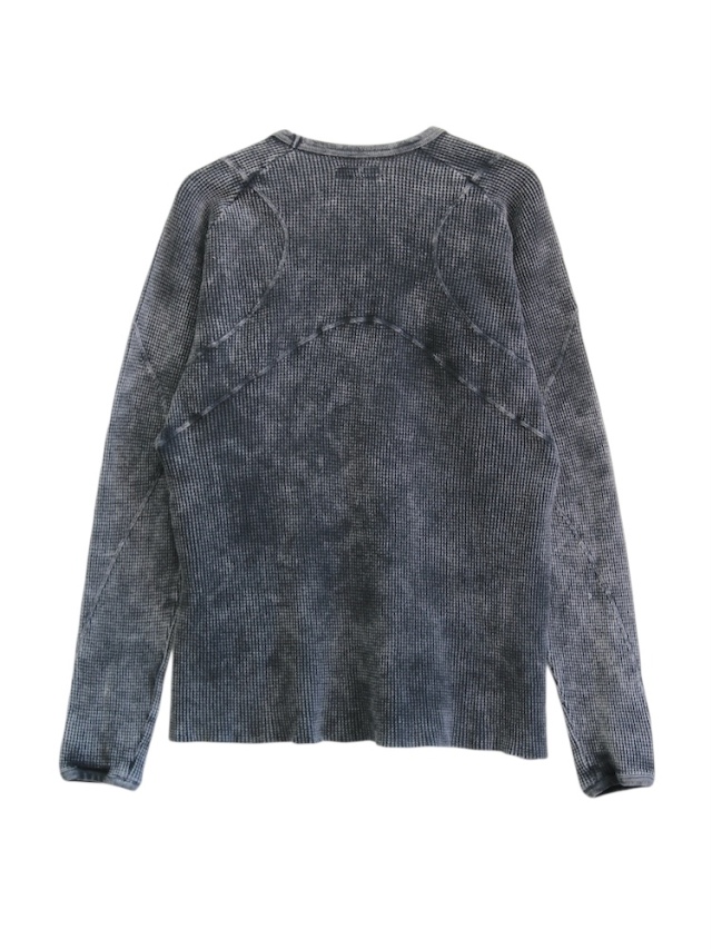 背面のX型と有機的な曲線デザインの切り替えが特徴的なロングスリーブTシャツ。ケミカルウォッシュによる独特な製品染めを施し、袖口には指貫きを採用している。製品加工商品のため個体差が生じます。